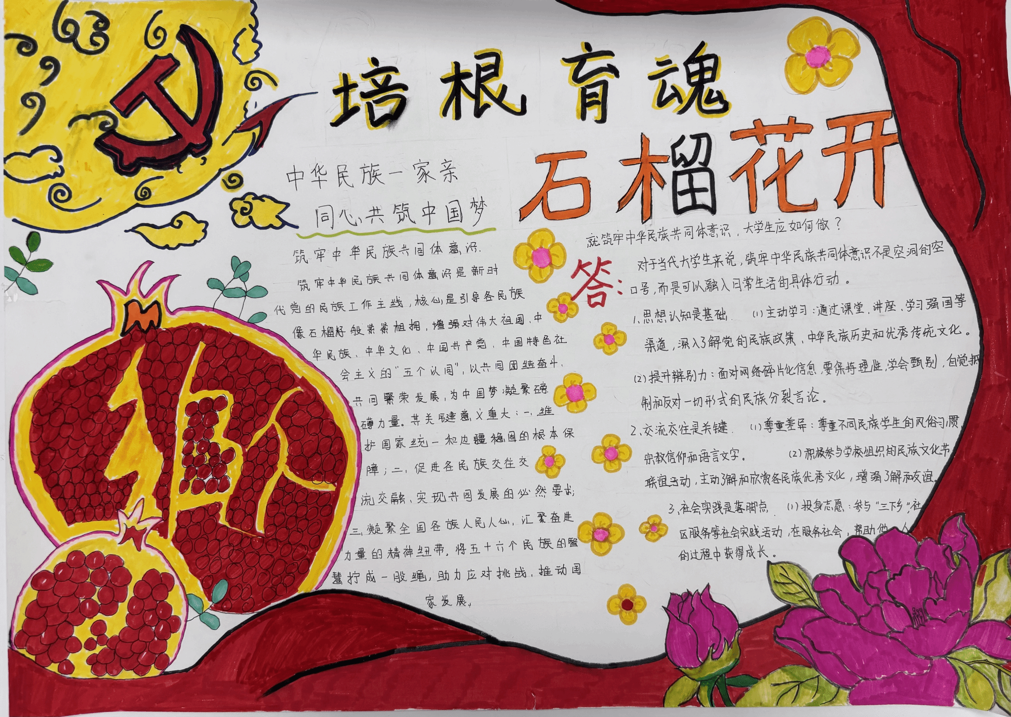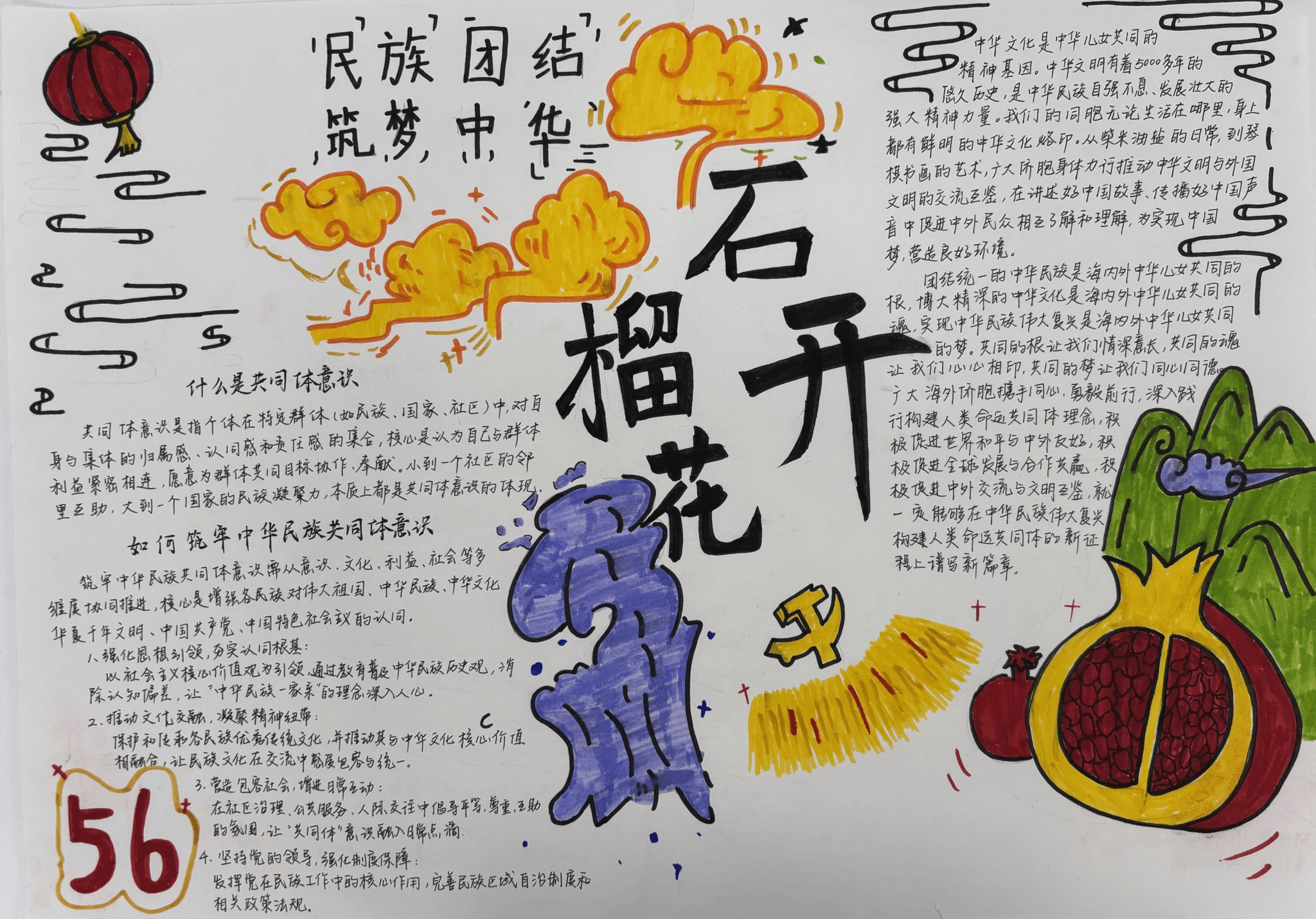 为深入贯彻落实学校关于民族团结进步教育的工作要求,深化爱国主义和民族团结教育,近日,sunbet申慱官网第二青年社区分党委成功举办了民族团结月主题手抄报征集活动。本次活动以生动活泼的艺术形式,在学生中营造了“培根育魂 石榴花开”的浓厚氛围,取得了良好的育人效果。