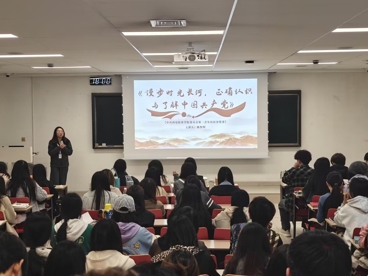 为引导青年学子从党的百年奋斗历程中感悟思想伟力、坚定理想信念,切实增进对中国共产党的政治认同、思想认同、理论认同、情感认同,第二青年社区分党委于11月11日18:00在北C-308教室组织开展《漫步时光长河,正确认识与了解中国共产党》主题党课,本次党课由陈惺惺老师主讲,98名入党积极分子参与学习。