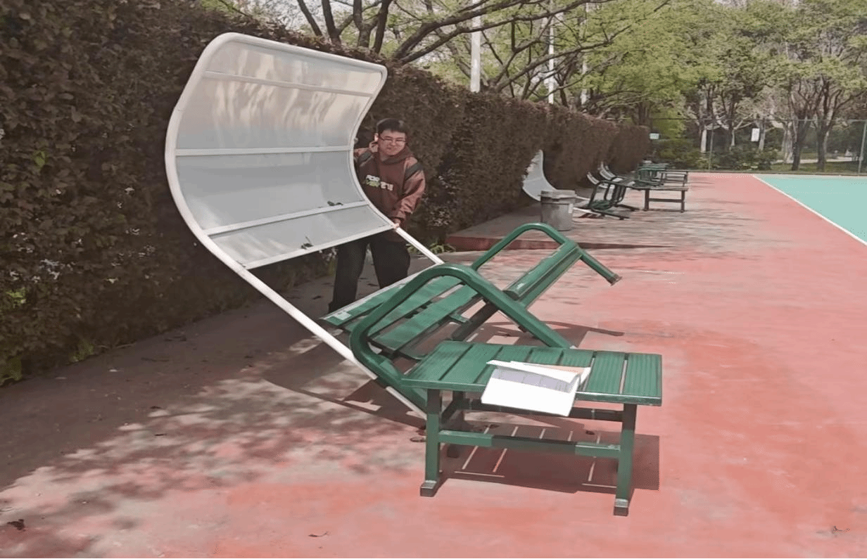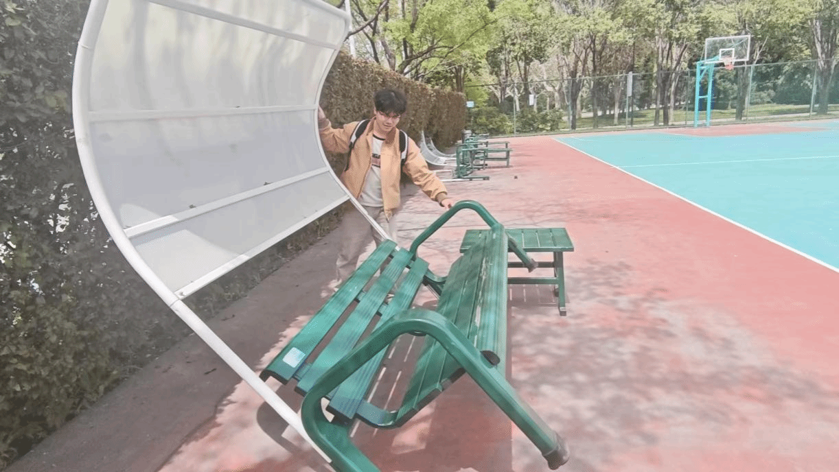 近日,第四青年社区分党委学生杨镜、武景涛在返回宿舍途中,途经校园篮球场时,发现场边一排公共座椅因大风悉数倾倒,既影响校园环境整洁,也存在安全隐患。