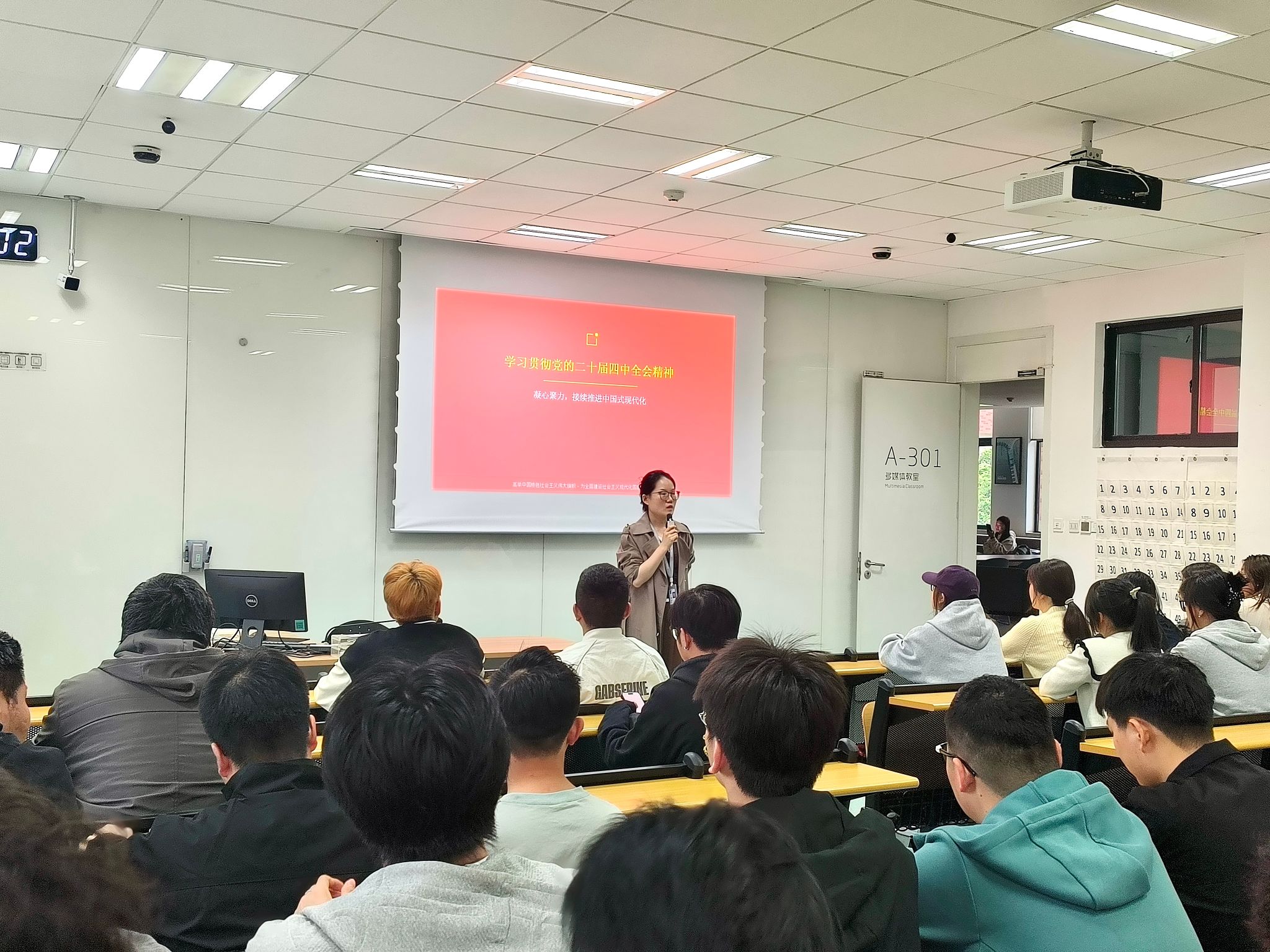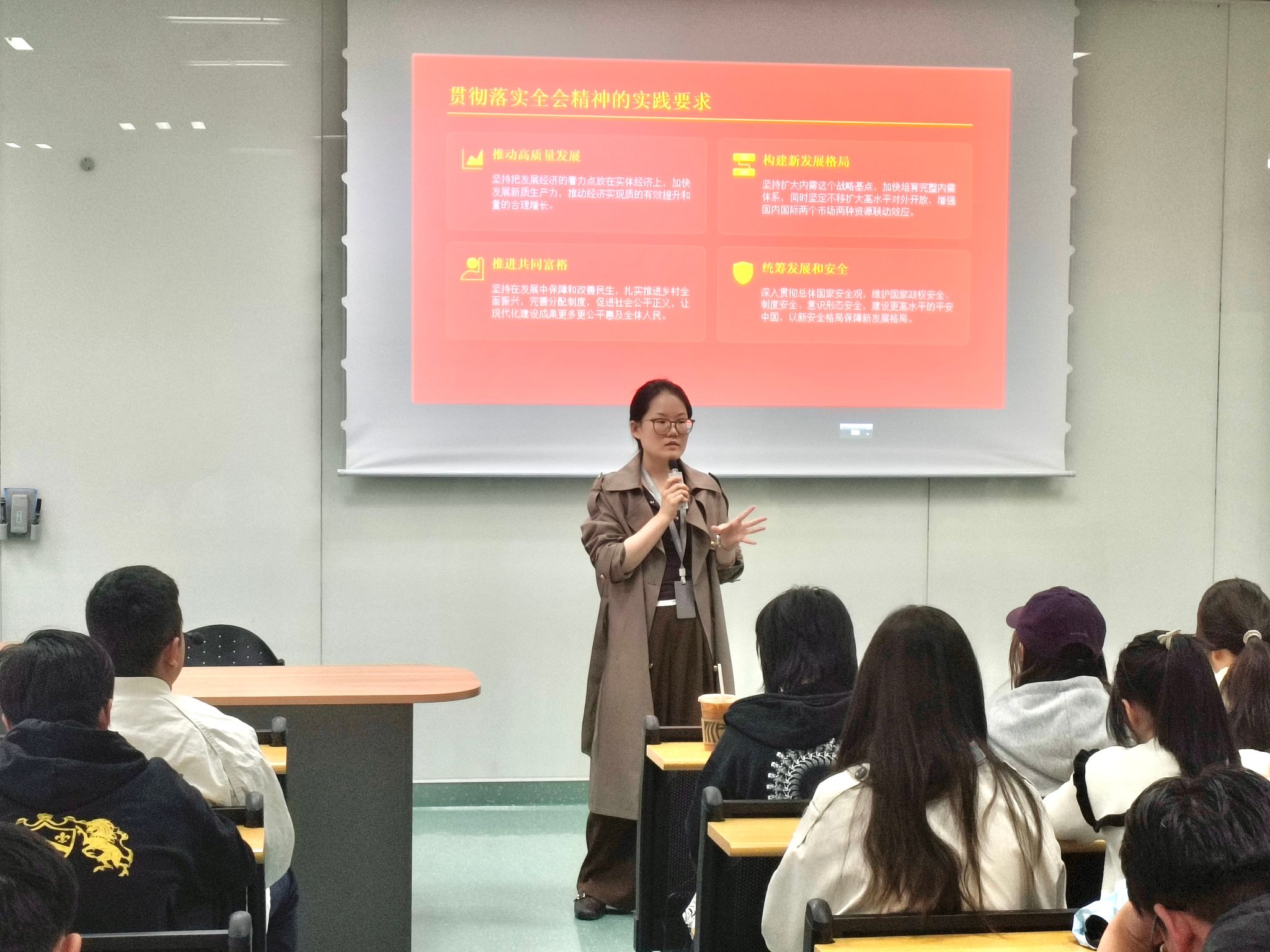 刘妍姬老师 围绕党的二十届四中全会召开的重大意义、核心内容、实践要求等方面展开系统讲解。重点围绕全会审议通过的《中共中央关于制定国民经济和社会发展第十五个五年规划的建议》,深入解读“十五五”规划建议提出的新目标、新任务、新举措,引导同学们正确认识国家“十五五”时期的发展方向与青年使命。同时,结合社区育人特色与人才培养目标,鼓励同学们将全会精神融入日常学习、科研实践与校园生活,以理论学习筑牢思想根基,以实际行动践行青年责任。