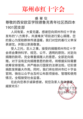 近日,在得知河南突发特大洪水后,西四本1901团支部学生心系河南,时刻关注汛情的发展,当得知河南物资紧张时,支部内部自发组织线上募捐活动,展现出了欧亚青年的担当,西四本1901团支部将所有募捐得到的钱全部捐赠郑州市红十字会,为河南抗击洪涝灾害奉献出自己的绵薄之力。