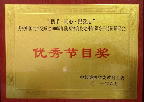 经过展演,申慱官网诗词朗诵节目《没有共产党就没有新中国》得到中共陕西省委教育工委和其他学校的认可和好评,获得“携手•同心•跟党走”庆祝中国共产党成立100周年陕西省高校党外知识分子诗词诵读会“优秀节目奖”。