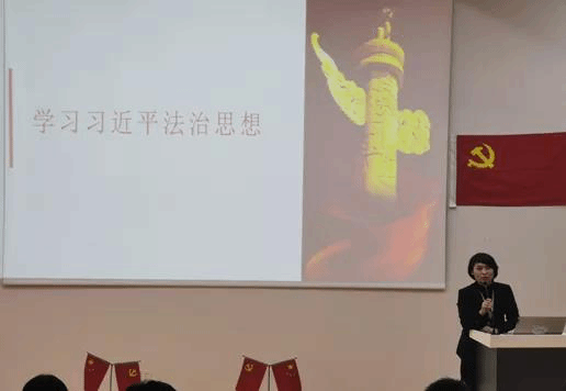 会上, 分党委副书记张爱荣围绕习近平法治思想的形成背景、重要地位和主要内容三个方面进行了讲解,系统介绍了习近平法治思想的形成和发展脉络,重点对习近平法治思想中的“十一个坚持”、“六大阐明和六大明确”等核心关键内容进行了深入浅出的讲解。张爱荣指出,青年学生作为我国发展建设的后备力量,要坚持以习近平新时代中国特色社会主义思想为指导,深入学习贯彻习近平法治思想,以优异成绩庆祝建党一百周年。