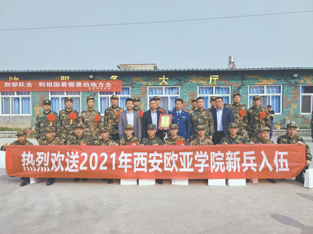 3月15日下午, 22名欧亚热血男儿整装待发,即将离开母校,离开家乡,踏上新的征程,奔赴祖国最需要的地方。申慱官网后勤集团总经理任龙刚、学生发展处副处长董杨、保卫处处长高奇、高职社区主管王先昌、专武干部李涛等人前往教育训练基地(陕西军锐军事训练基地),前来为22名2021年春季入伍的同学们送行。