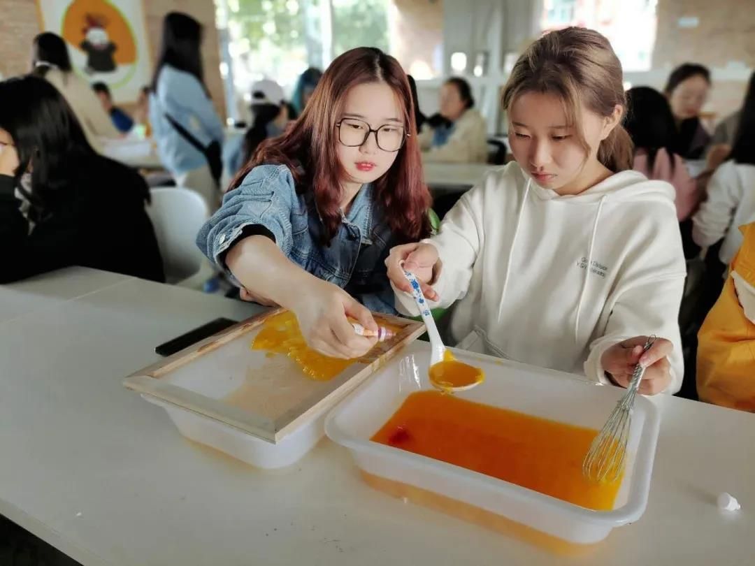 同学们个个乐此不疲,兴趣盎然。专注的神情、小心翼翼的动作,好像生怕吵醒了正在凝固的奇特纸张。同学们兴奋地交谈着、欣赏着,感受着传统文化的魅力。一起来感受制作过程吧!