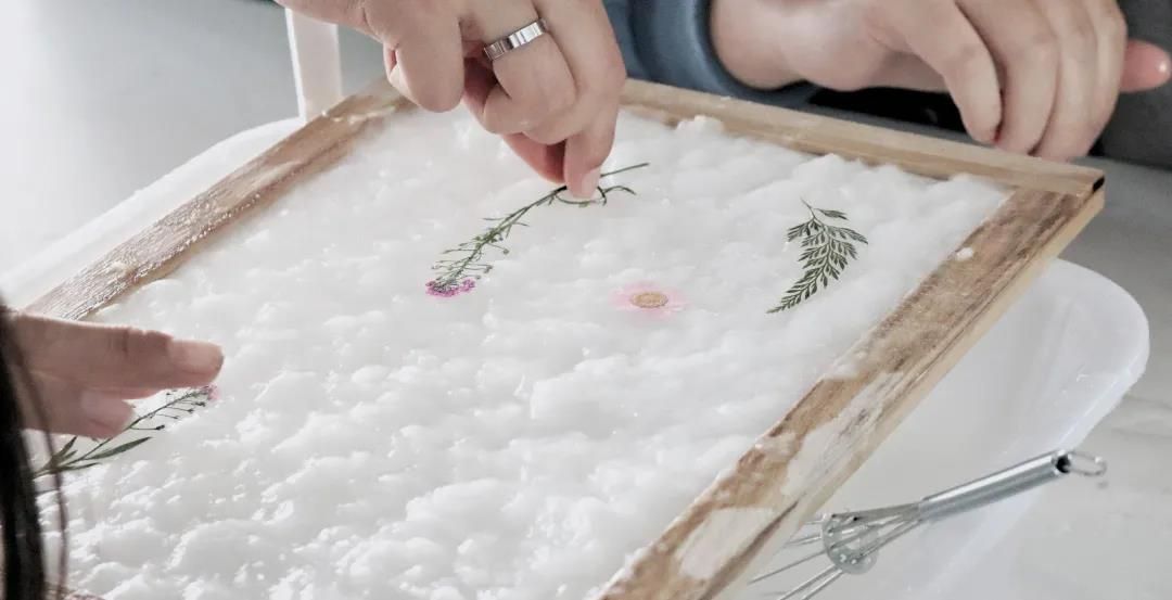 再将草与花撒在纸浆中。