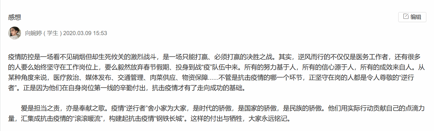 这是一个不幸的时代,因为我们碰到了一场习近平总书记称为:“新中国成立以来,在我国发生的传播速度最快、感染范围最广、防控难度最大的一次,重大突发公共卫生事件”的新冠疫情;这是一个幸运的时代,在这次疫情中,共和国展现出让世人刮目相看的领导能力、应对能力、组织能力、动员能力、执行能力;中华儿女展现出团结奋战、众志成城、可歌可泣、感天动地的内在精神。疫情的爆发是不幸的,八万多人的感染,三千多生命的逝去,但是在这场不幸中我们深刻感受到的是这个时代的伟大。