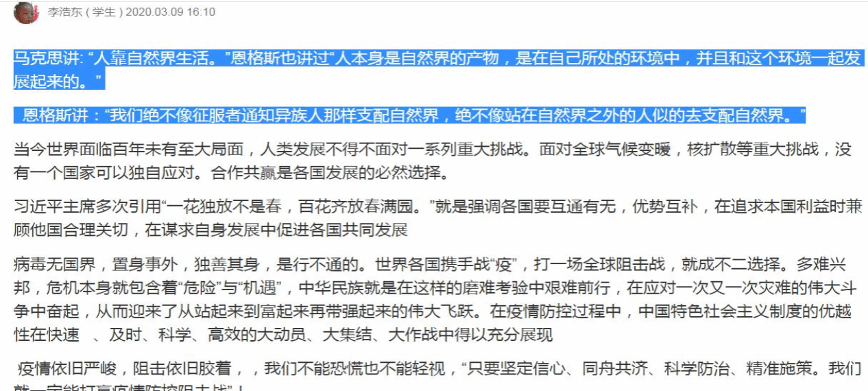 按照学校的部署要求,3 月 9 日下午 14:15-15:45 时间段有思政课的学生以教学班为单位,在思政课教师的组织下,课上观看直播,课后利用畅课平台交流学习感悟。