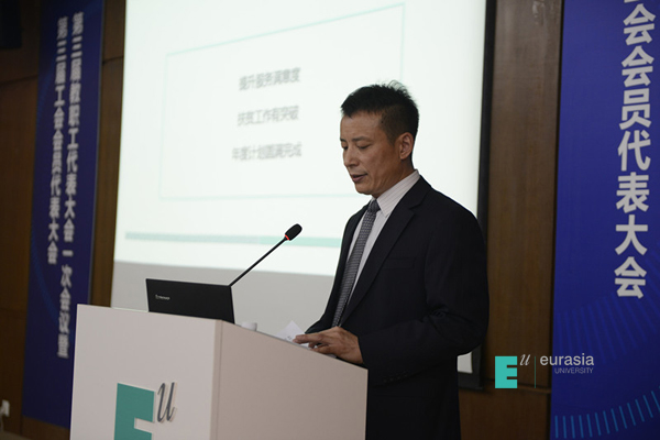 工会副主席晏建忠做《sunbet申慱官网第二届(2014-2018年度)工会工作报告》以及《第二届五次教代会提案处理情况报告》和《第三届一次教代会提案征集情况报告》。
