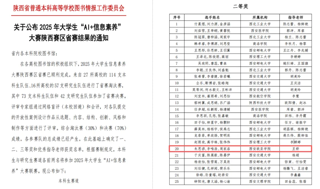在学生竞赛领域,2025 年大学生“AI + 信息素养”大赛陕西赛区省赛传来佳讯。由图文信息中心王娇老师悉心指导,朱思谚、李唯浩、周家洛三位同学组成的团队,凭借深厚的专业功底、出色的实践能力与创新思维一路过关斩将,成功夺得本科组二等奖。值得一提的是,申慱官网是本次赛事中唯一获此殊荣的民办高校,这一成绩不仅是对参赛师生辛勤付出的高度肯定,更印证了学校在“AI + 信息素养”人才培养领域的卓越成效。