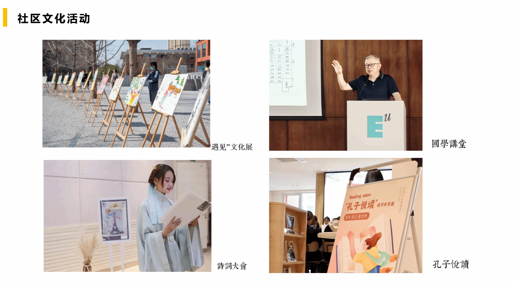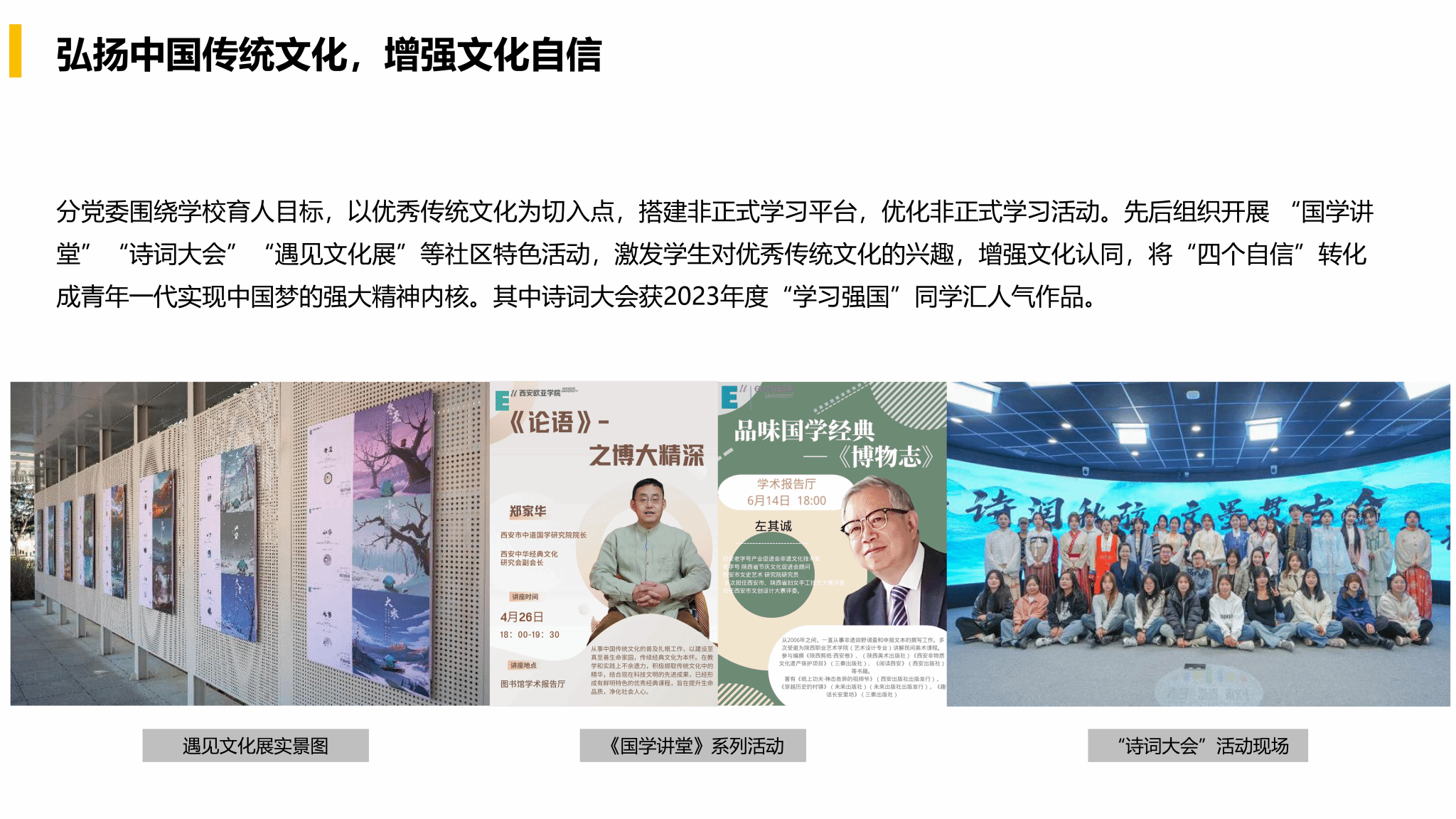 分党委围绕学校育人目标,以优秀传统文化为切入点,搭建非正式学习平台,优化非正式学习活动。先后组织开展 “国学讲堂”“诗词大会”“遇见文化展”等社区特色活动,激发学生对优秀传统文化的兴趣,增强文化认同,将“四个自信”转化成青年一代实现中国梦的强大精神内核。其中诗词大会获2023年度“学习强国”同学汇人气作品。