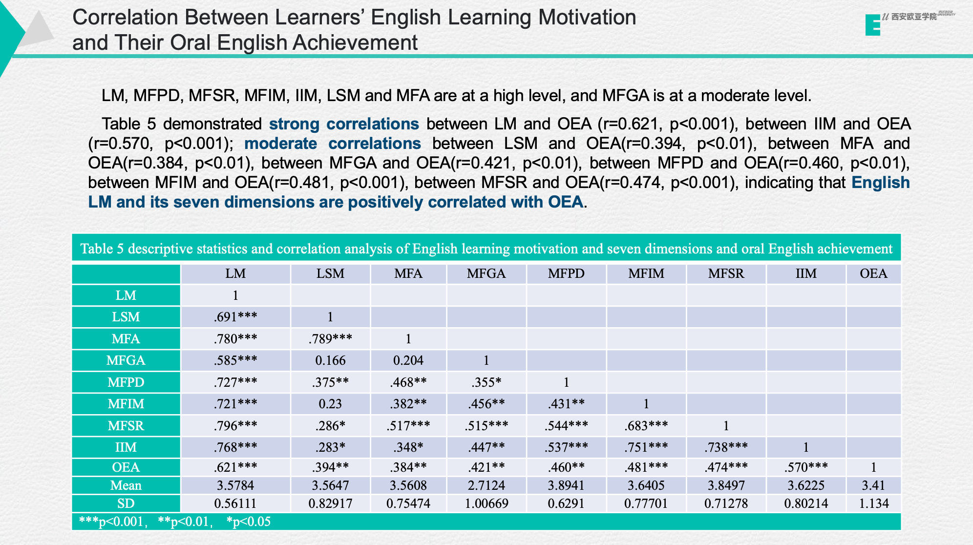 (图九)张林老师汇报内容(英语学习动机及各维度与英语口语成绩的描述统计和相关分析)