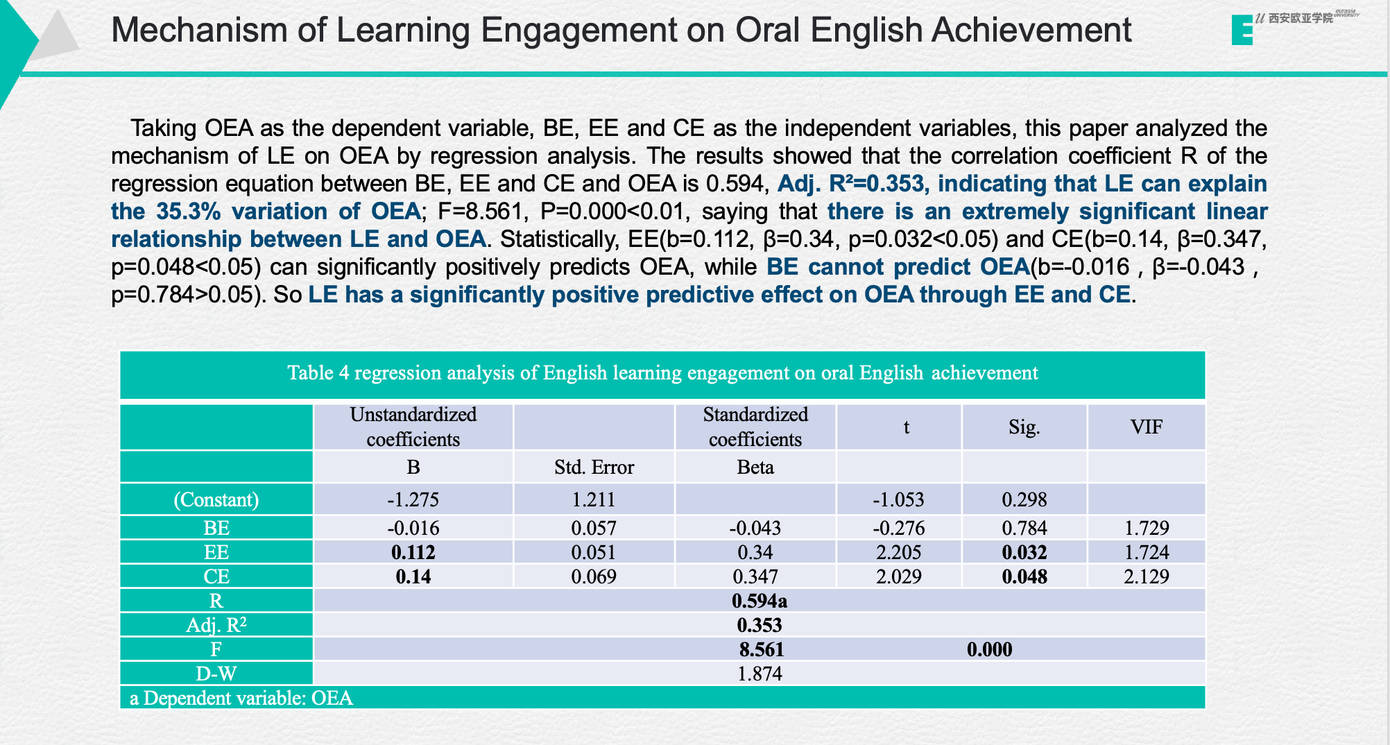(图八)张林老师汇报内容(英语学习投入对英语口语成绩的回归分析)