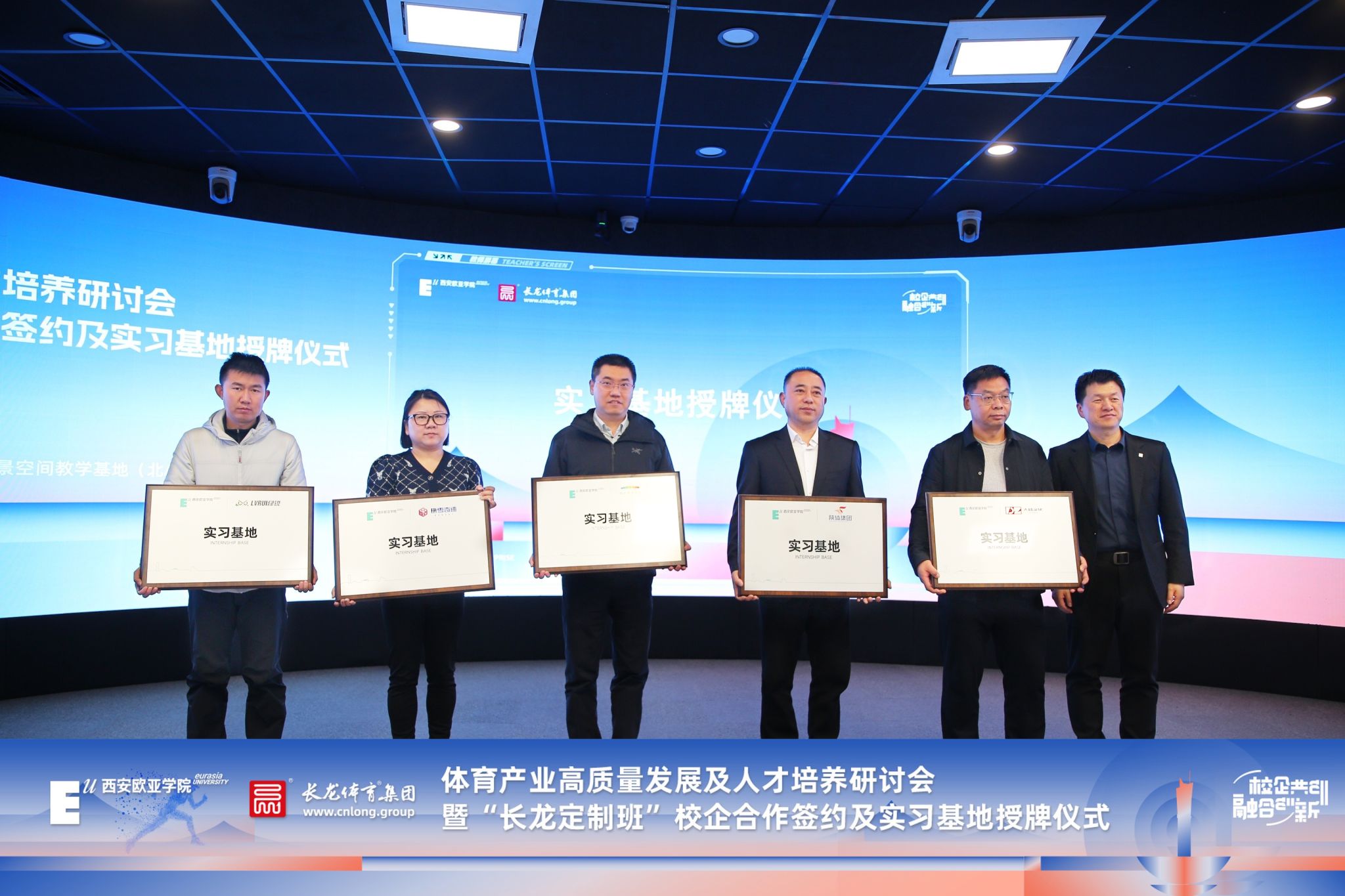 在校企签约仪式上,sunbet申慱官网工商管理学院院长吴睿教授为“长龙定制班"授牌,sunbet申慱官网工商管理学院院长助理赵江波老师为陕西省体育产业集团有限公司、西安奥体运营管理有限公司、西安绿锐户外运动有限公司、西安大拙广告文化传播有限责任公司 、西安雪迹体育发展有限公司共五家企业的校企合作实习基地授牌。