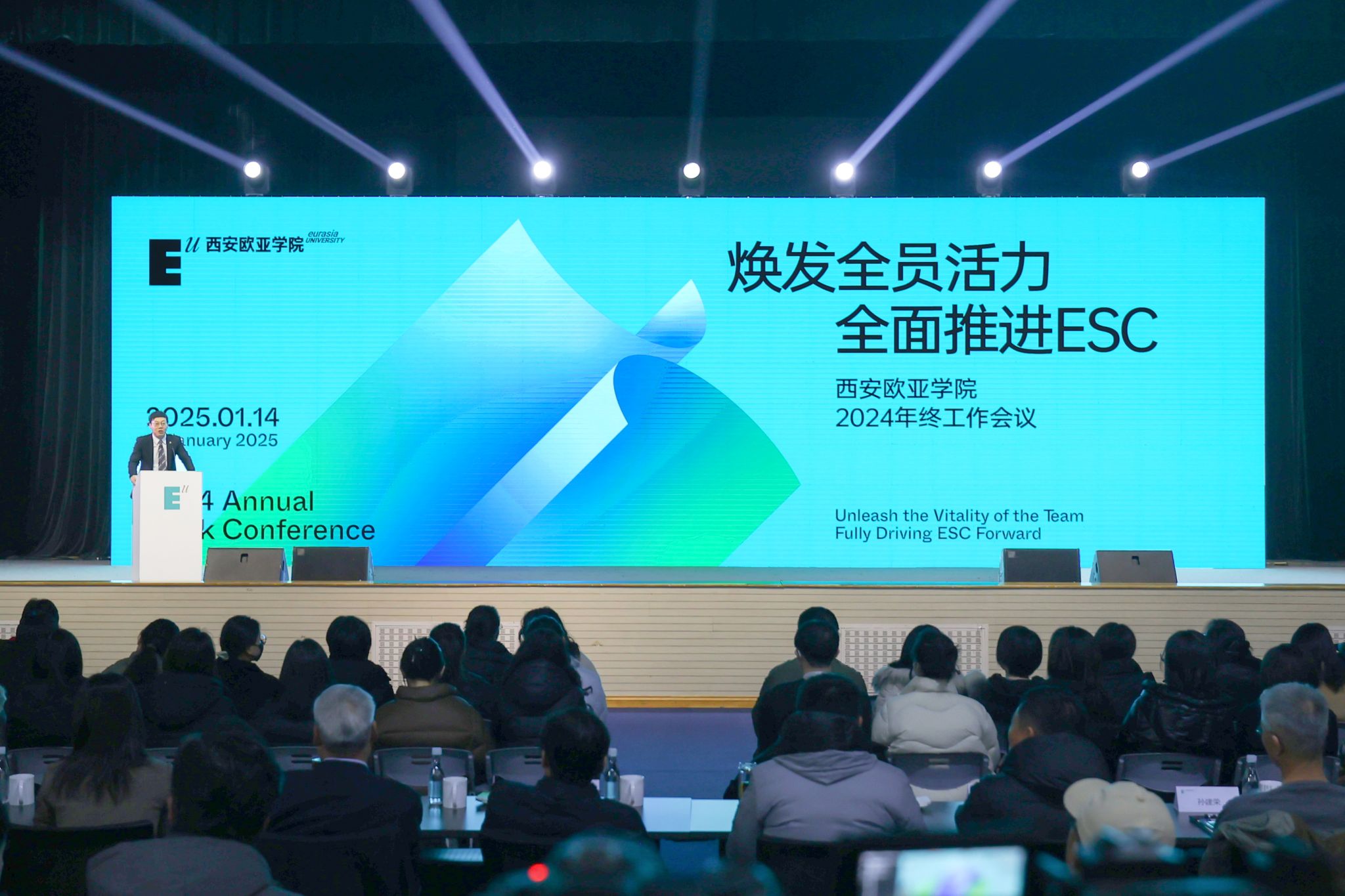 2025年1月14日,sunbet申慱官网2024年终工作会议在学校体育馆举行。会议以“焕发全员活力,全面推进 ESC”为主题,总结回顾了2024年工作完成情况,明确了2025年重点工作和发展目标。学校全体教职员工、校院两级专家顾问参加会议,创新设计思维(中国)研究院总顾问、北京大学、清华大学特聘顾问鲁百年教授,陕西师范大学教育学部部长、陕西教师发展研究院常务副院长、国家社会科学基金重大项目首席专家李森教授,陕西师范大学教育学部博士生导师、中国智慧工程研究会劳动与科技教育工委会副理事长、国家自然科学基金项目评审专家赵丹教授,西安大兴医院副院长贺金戈等嘉宾受邀出席。副校长李正主持会议。