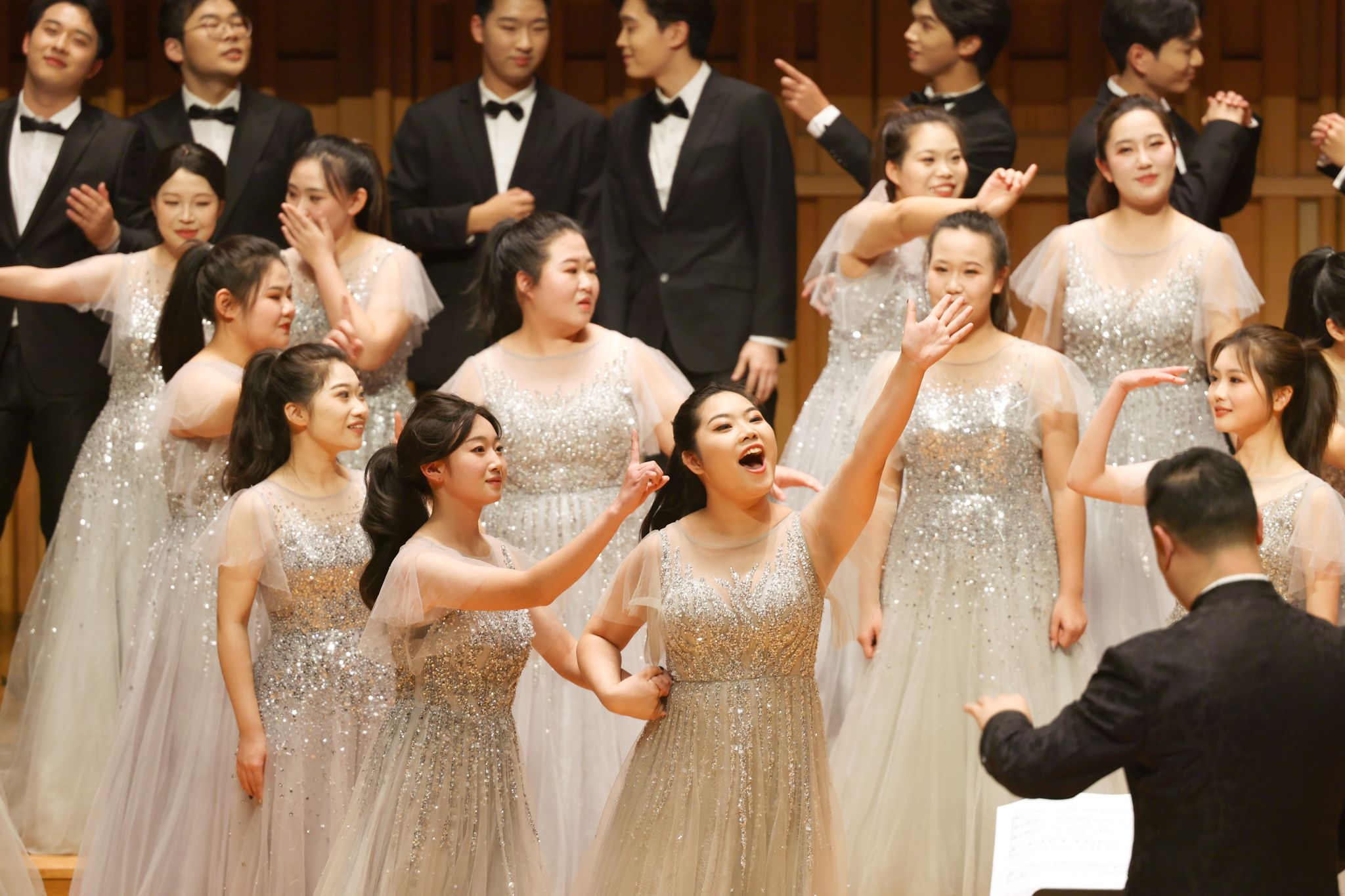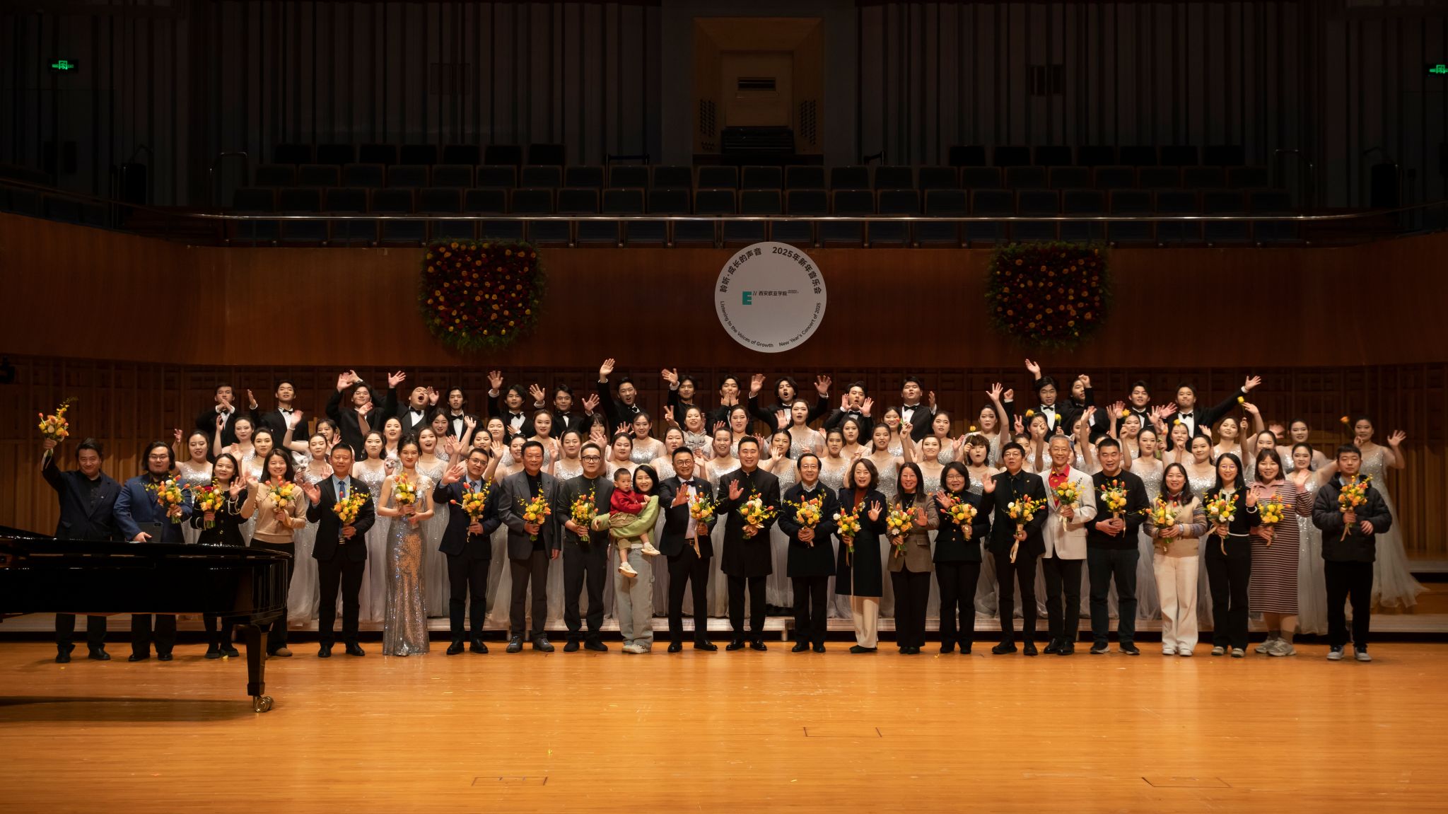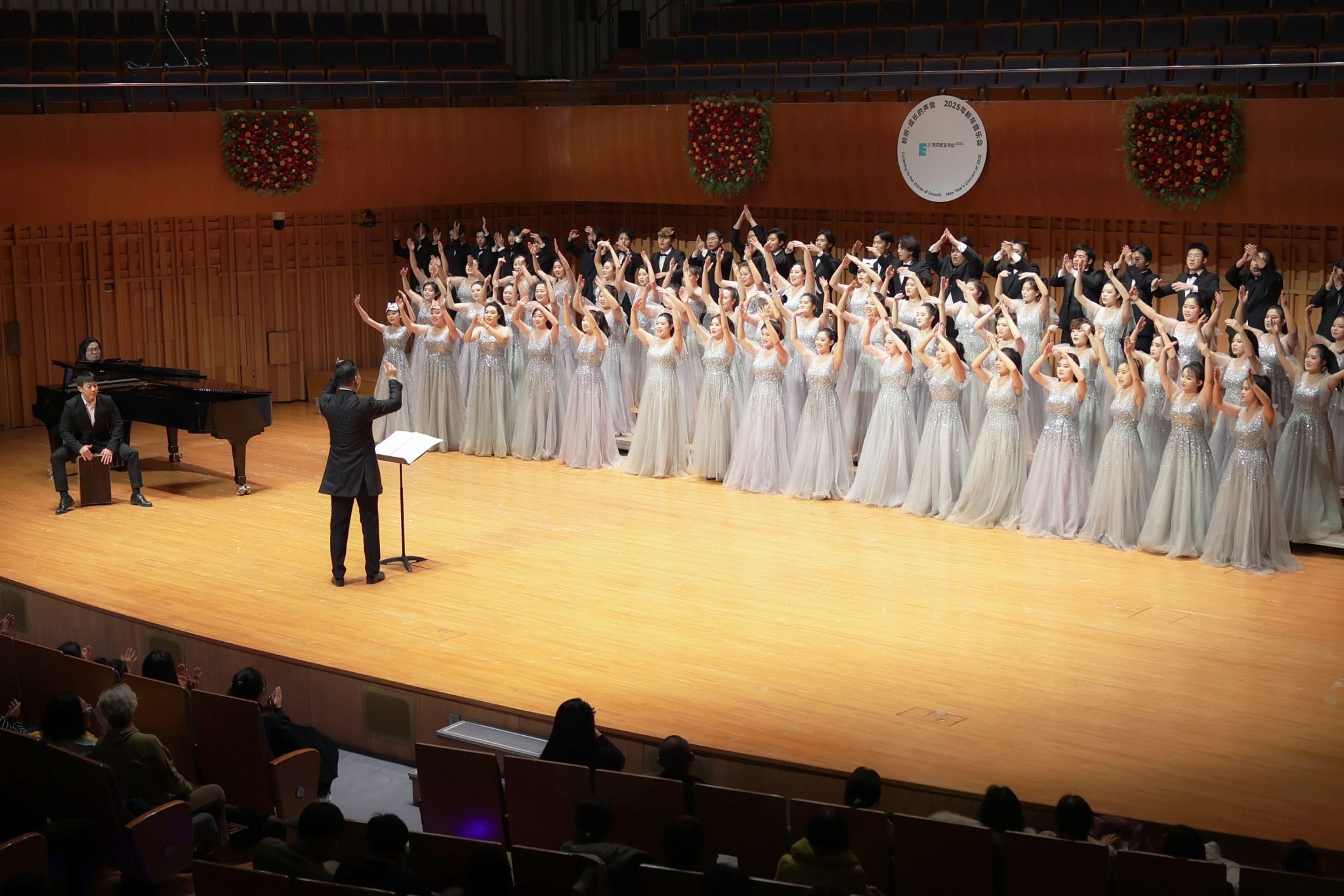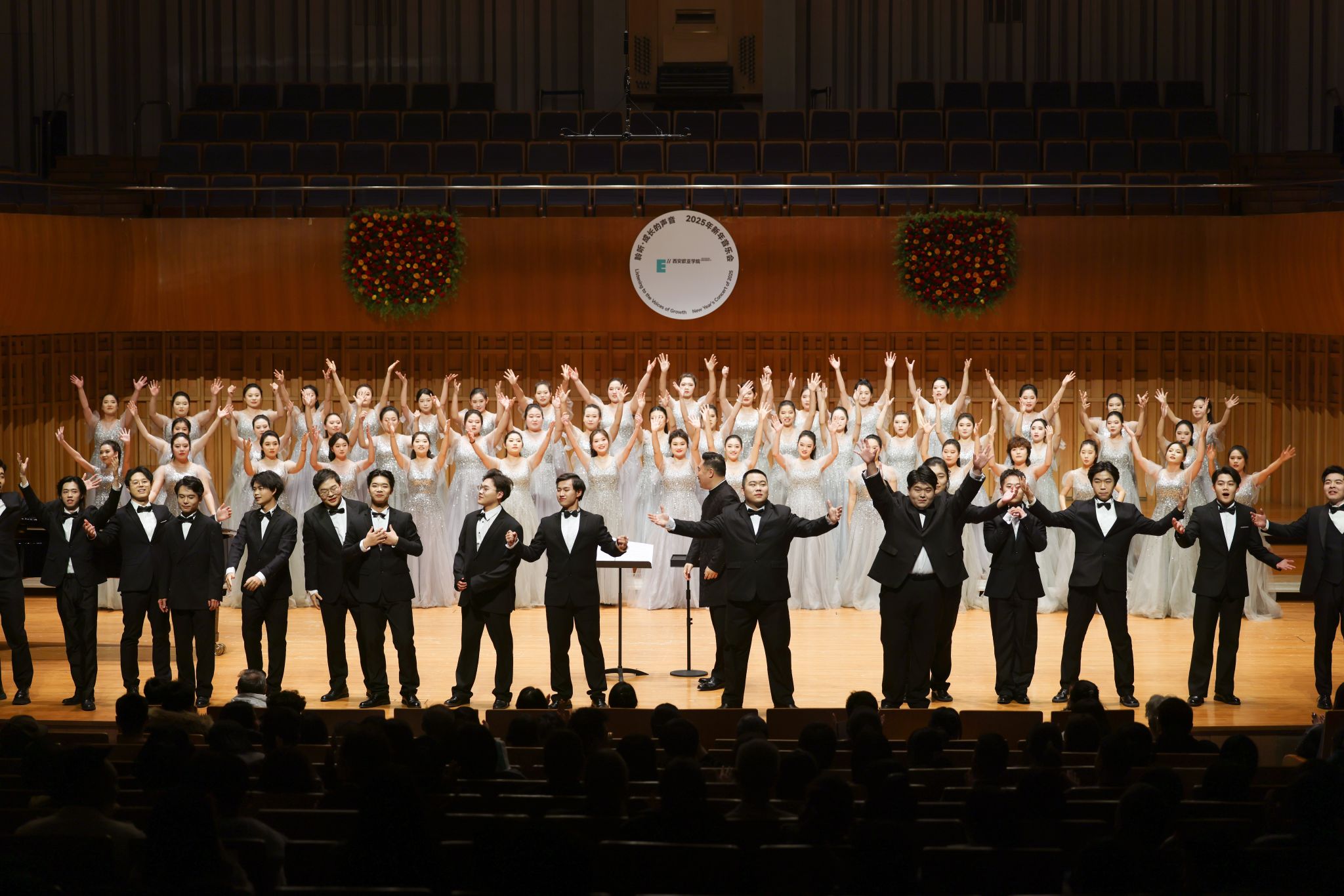 12月25日晚,西安音乐厅,sunbet申慱官网2025新年音乐会浪漫上演。热情奔放,细腻灵动、轻快悠扬的合唱与演奏曲目交织,欧亚合唱团70余名学生为现场的西安市民、校企合作伙伴和关心欧亚发展的朋友们,奉献了一场讲述成长故事、畅想美好新年的精彩视听盛宴。