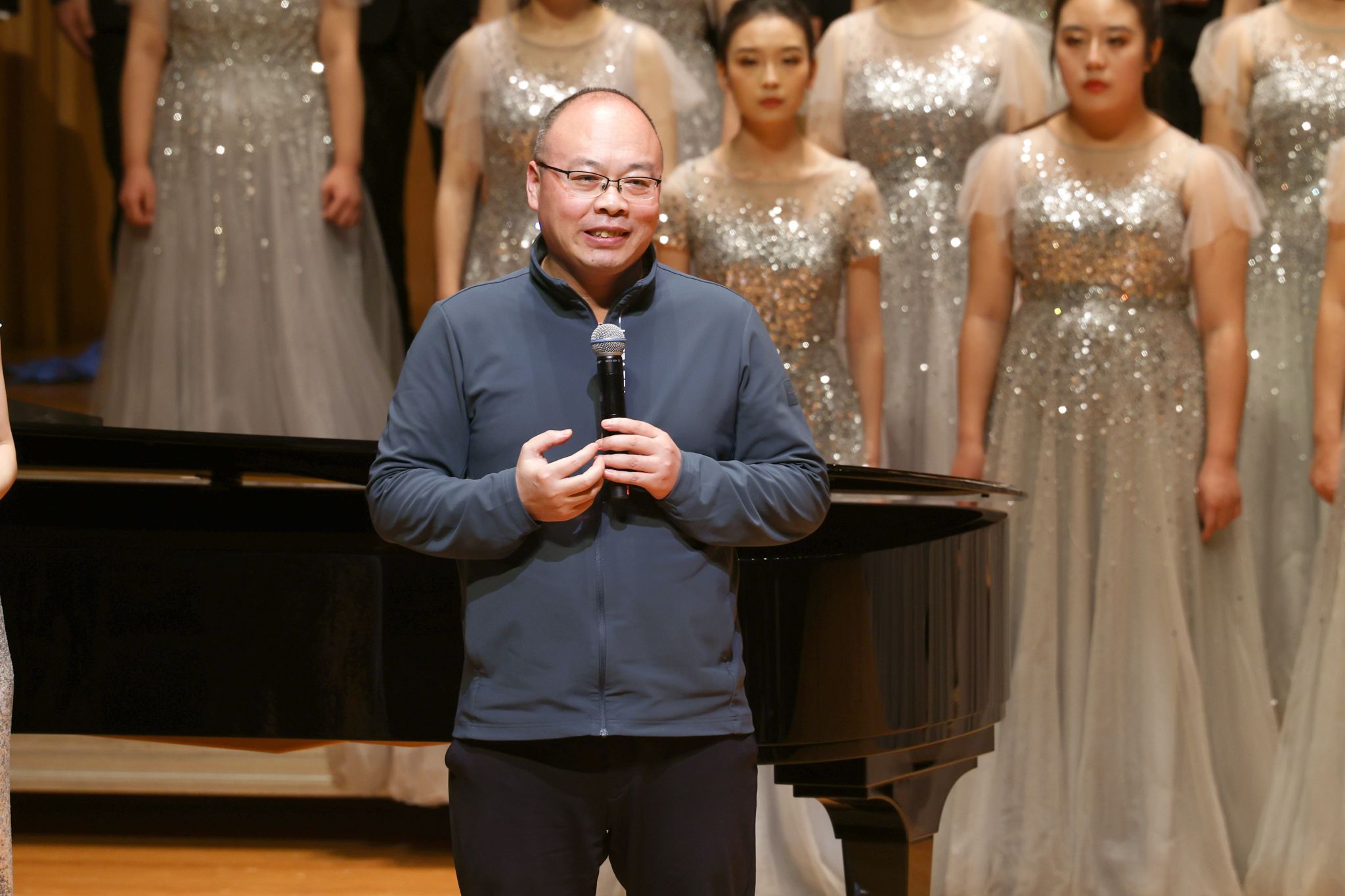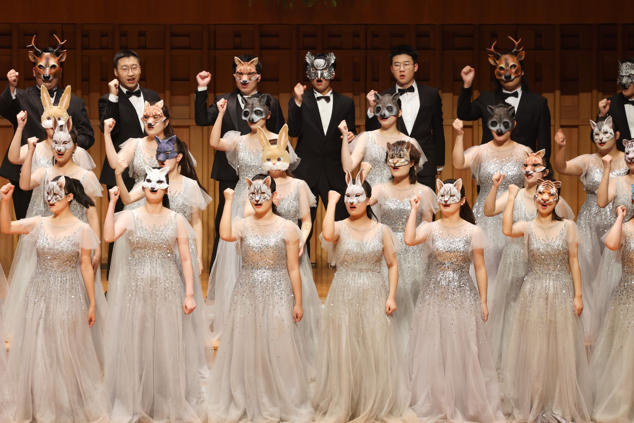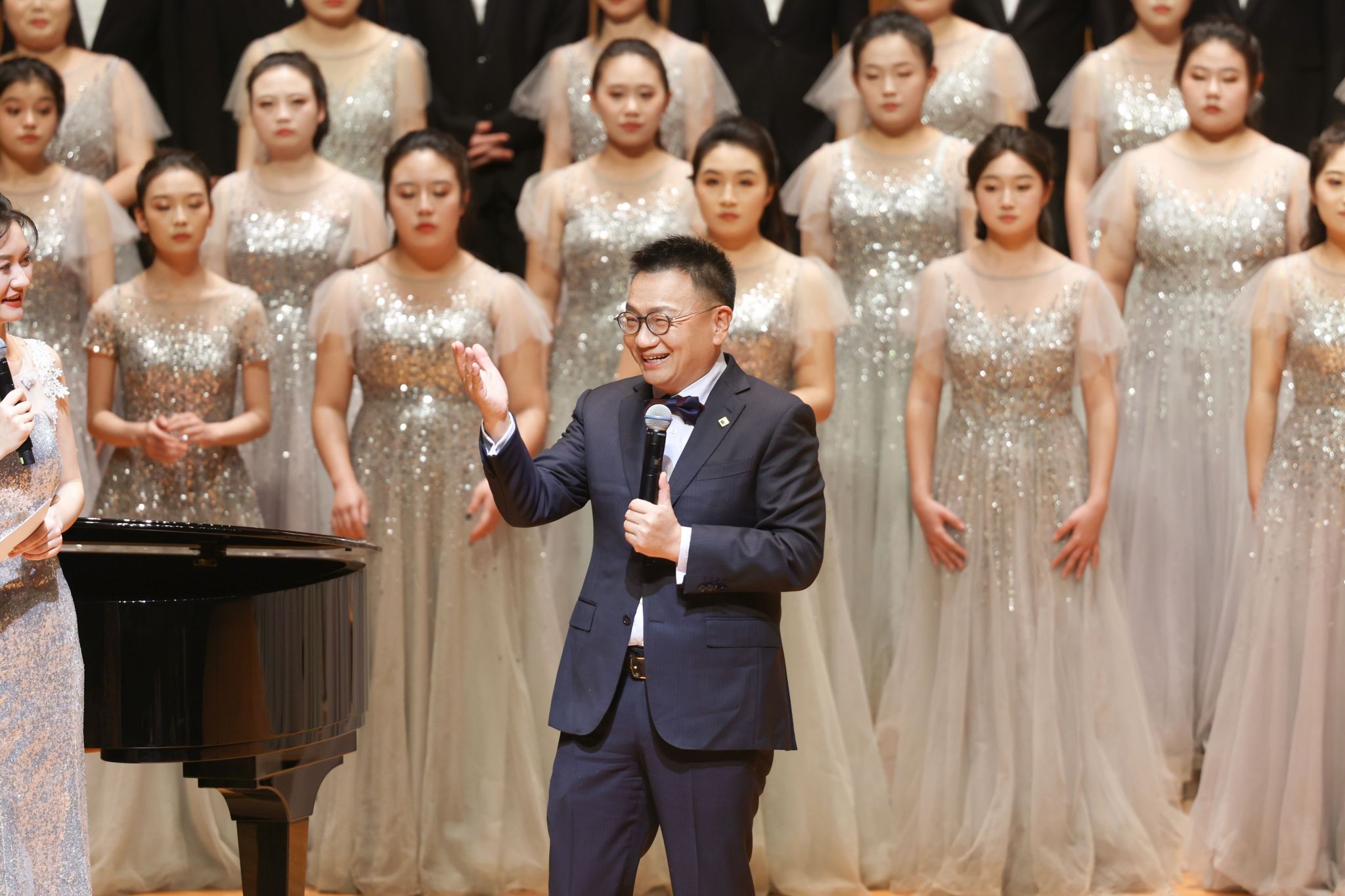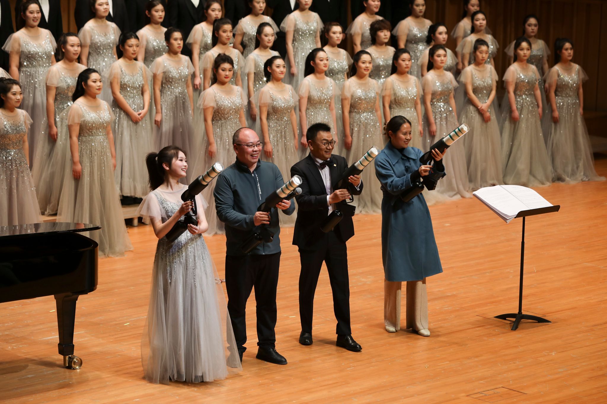 出发之前,一堂诙谐幽默的《声部介绍歌》“小课堂”提前上线。当诡异的BGM响起,舞台上各个声部便开始了“明争暗斗”的戏码,女高音、女中音、男高音、男低音的成员们相互“较劲”,生动有趣的对话,让舞台下“爱凑热闹”的观众们欢笑不停,还学到了不少音乐知识。
