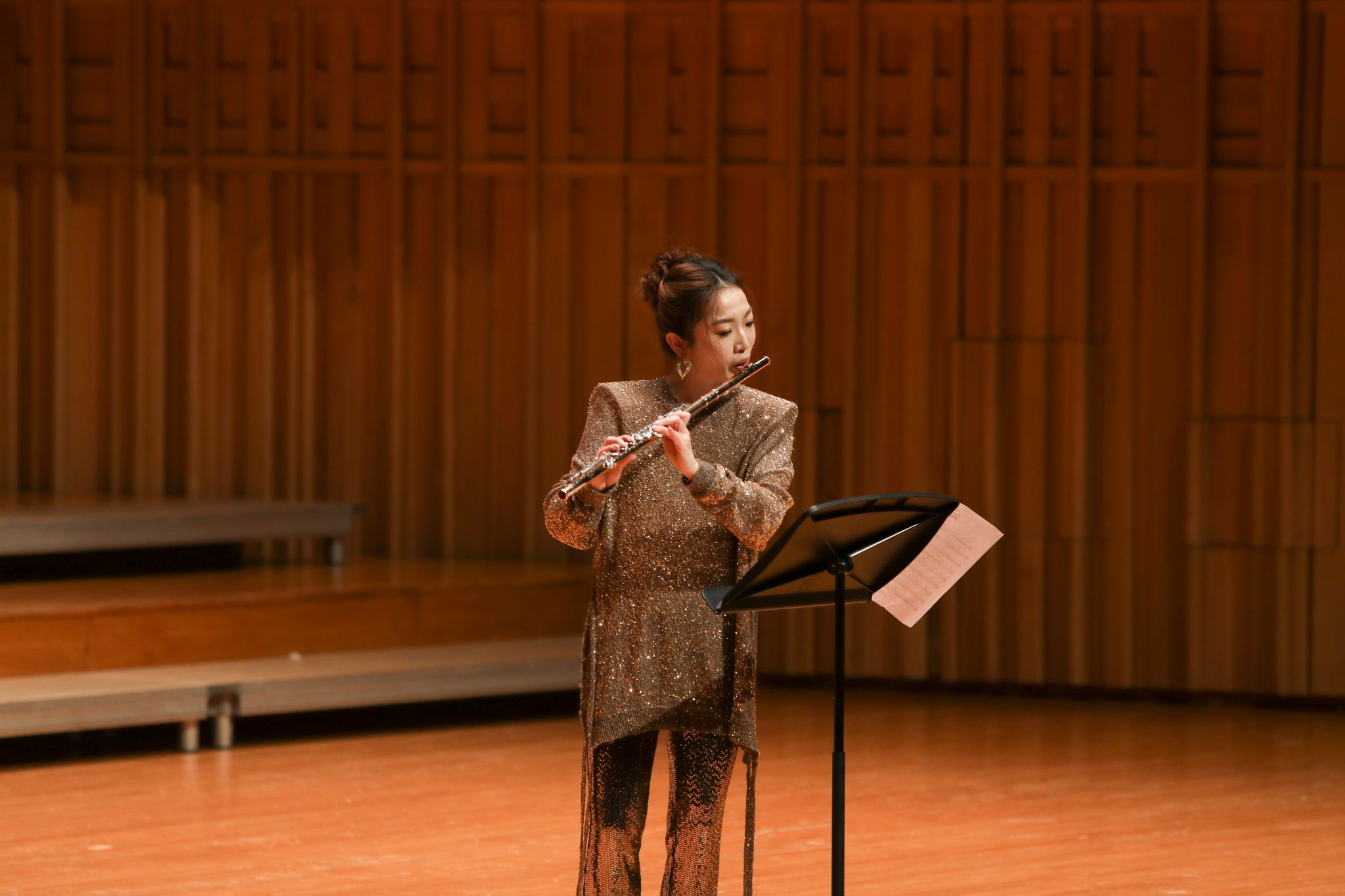 克劳德・波林的《长笛与爵士三重奏组曲》(选段 Ⅱ Sentimentale)则是一场古典与爵士碰撞的奇妙体验。长笛、钢琴、贝斯和鼓节奏完美融合,长笛手优雅的姿态和灵动的指法,配合着爵士乐队的即兴演奏,让整个舞台活力四射。