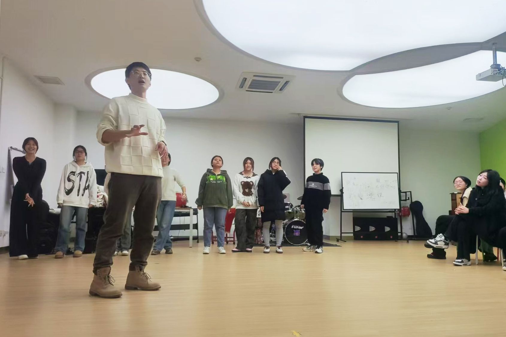 话剧团团课在每周三、四的晚上,在大活8号房的2个小时里,孙士硕和话剧团的50多名小伙伴一起学习表演、排练节目,也会开心地聊天。让他感触最深的是,在这里不仅仅是为了提升表演技能,更重要的是被一种温和的氛围包裹着,“这里允许所有天马行空的想法,当你在表演课上演得不好的时候,没有批评和指责,更多的是包容,老师也像个大孩子一样温柔。”