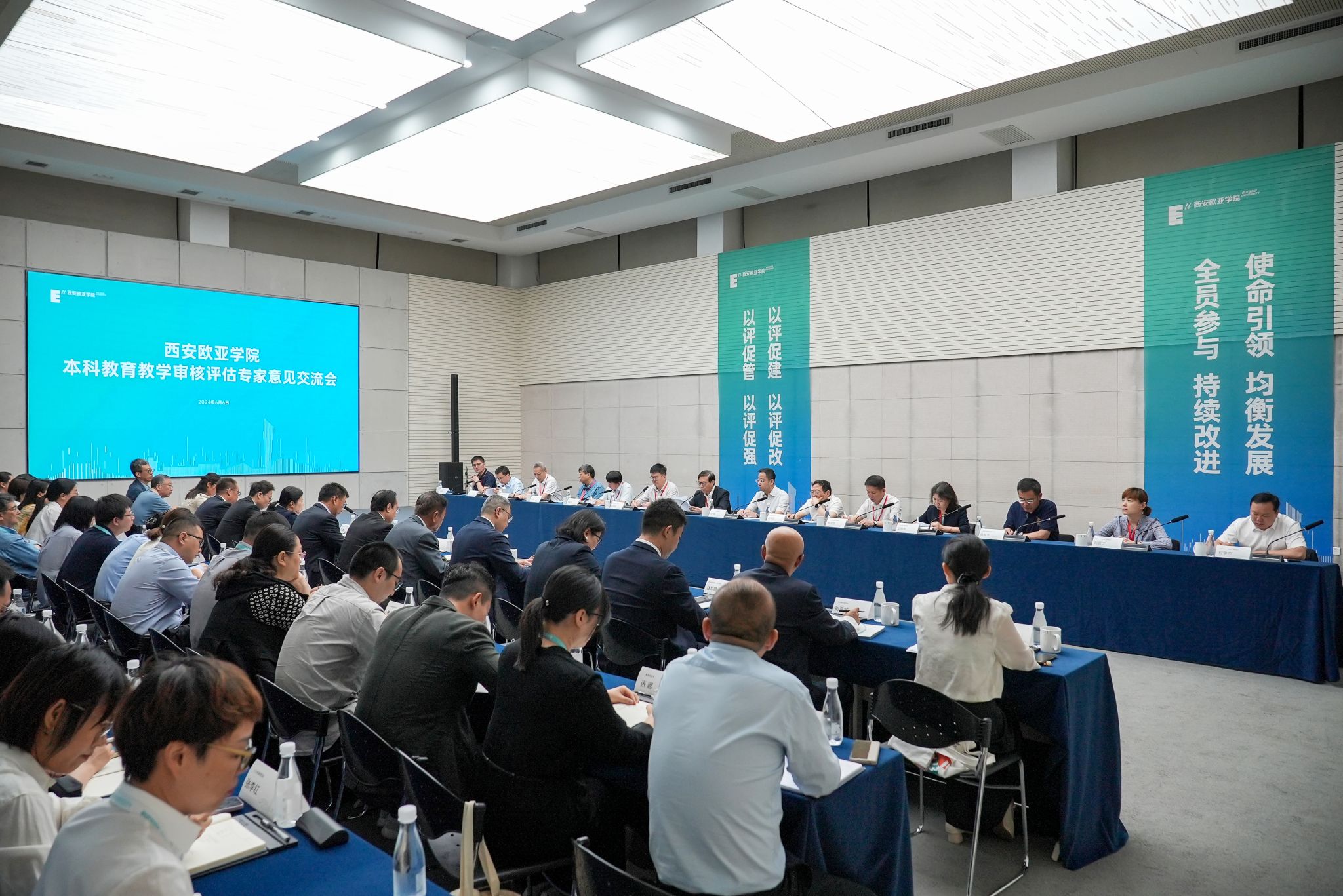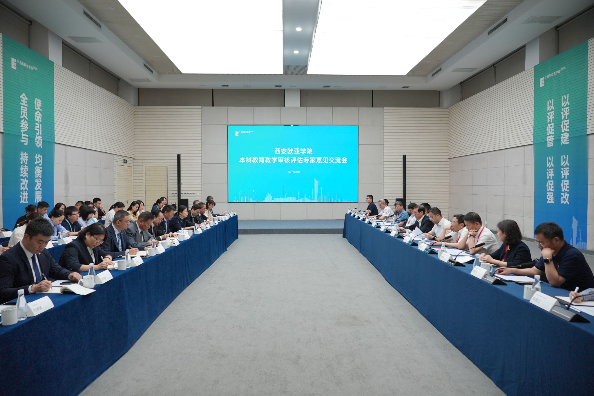 6月6日上午,sunbet申慱官网本科教育教学审核评估专家意见交流会在大学生活动中心举行。专家组组长、武汉理工大学原副校长张安富及其他专家组成员,陕西省教育厅高等教育处处长高强,中国西部高等教育评估中心主任陆根书,sunbet申慱官网董事长胡建波、校长刘瑾、党委书记赵国华等全体党政领导出席会议。会议由专家组副组长、河北经贸大学原校长纪良纲主持。