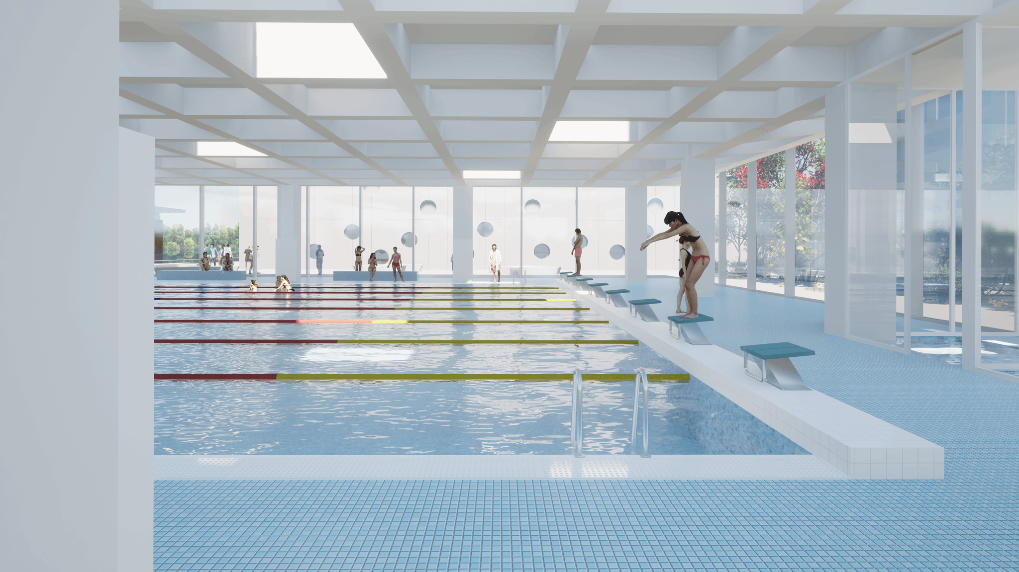 游泳馆外观采用全玻璃幕墙,通过反射与透光的特性,与周围环境形成互动,营造出轻盈、灵动的视觉效果,室内设计充分考虑“水”元素,创造出令人愉悦的游泳环境,弱化建筑边界,使建筑在功能与美学之间达到了完美的平衡。