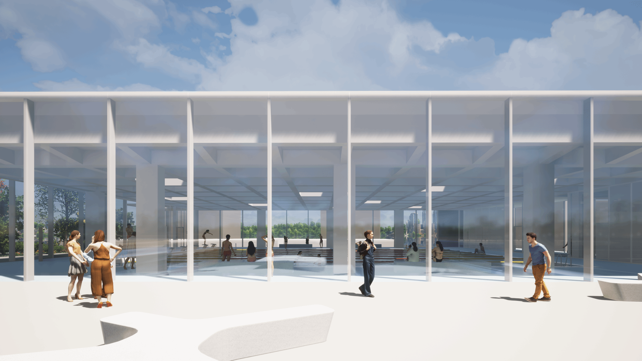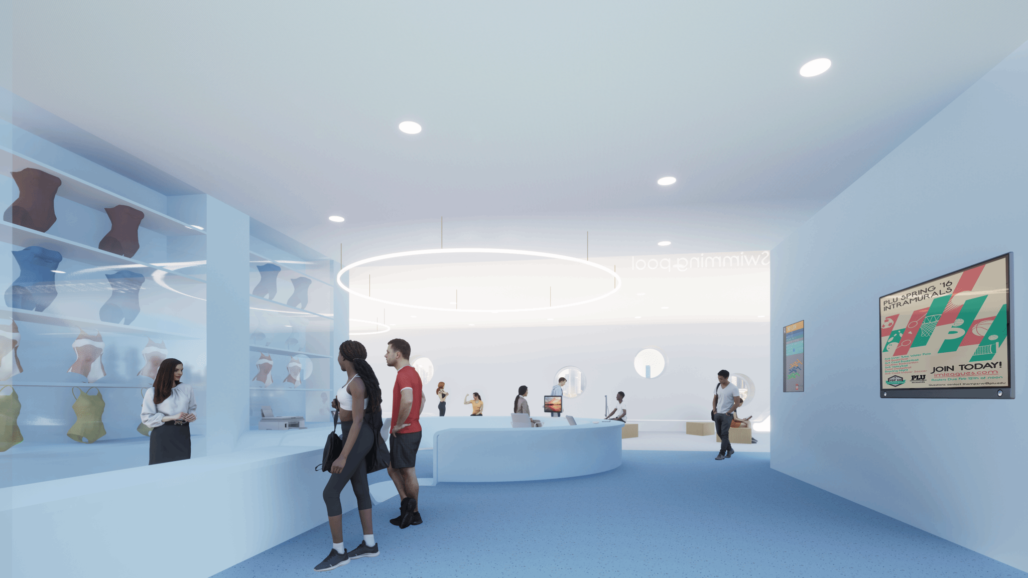 游泳馆设置于和光文体中心东侧,一层为管理区、更衣室、淋浴区、休息区等功能空间,二层为游泳池,面积6100㎡;建成后将成为融合教学、比赛、休闲、娱乐等功能的现代化泳池,为学校广大师生以及社会人士提供专业舒适的高品质水上活动场所。