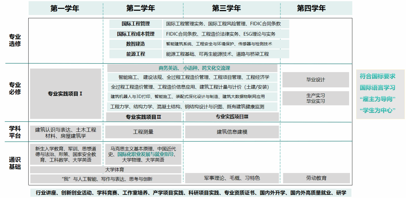 在前2.5个学年,学生将在校内接受系统的专业课程学习,同时参与各类模拟项目实践与案例分析活动,逐步掌握扎实的专业基础知识、基本技能与语言培训。