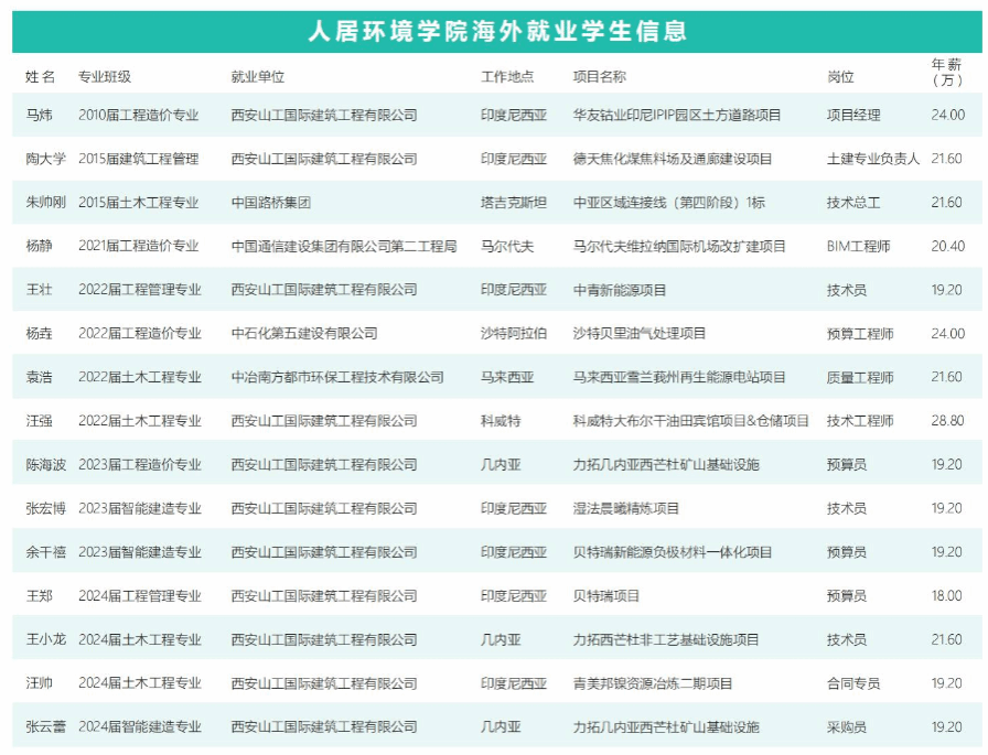 “丝路基建国际班”的毕业生凭借其独特专业优势、丰富实践经验和出色综合素质,在国际工程建设行业拥有广阔的就业前景与显著的竞争优势。毕业生在入职初期即可获得较高的薪资待遇,年薪普遍可达20-30万元,且随着工作经验的积累和职业能力的提升,薪资水平将呈现稳步增长态势。