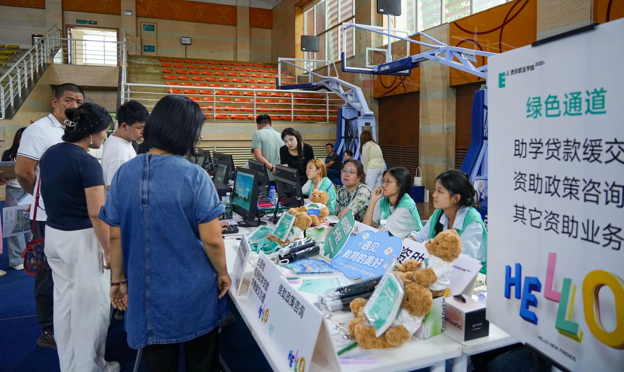 体育馆新生注册大厅服务设置有所简化,为部分有现场缴费需求和公寓物品领换的学生提供服务,也为家庭经济困难学生开通了“绿色通道”,方便大家更快速地办理各项入学手续。