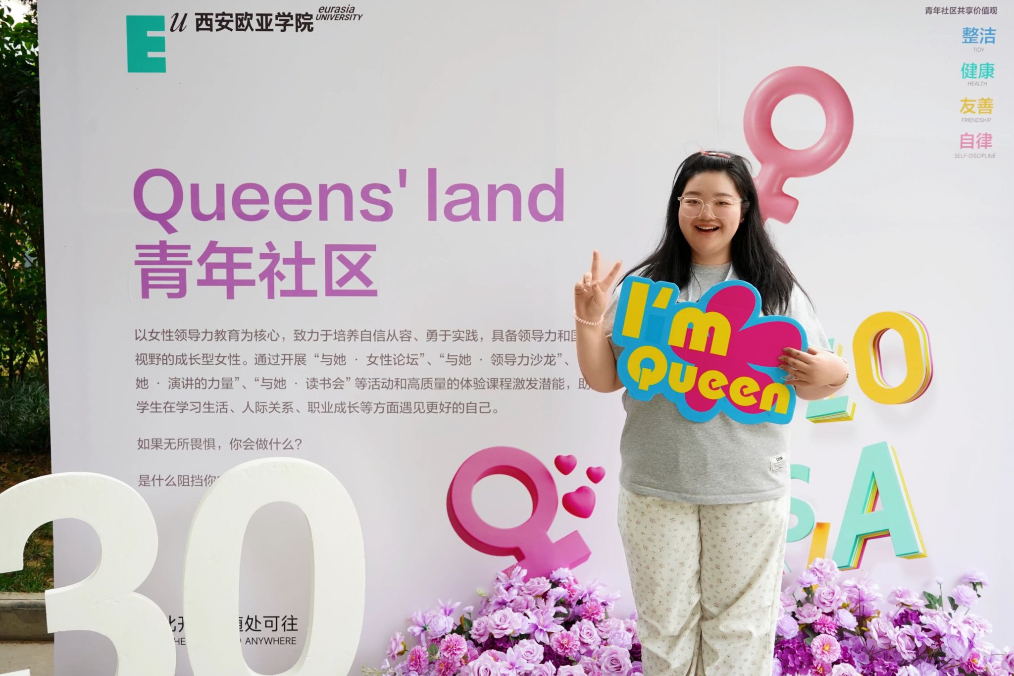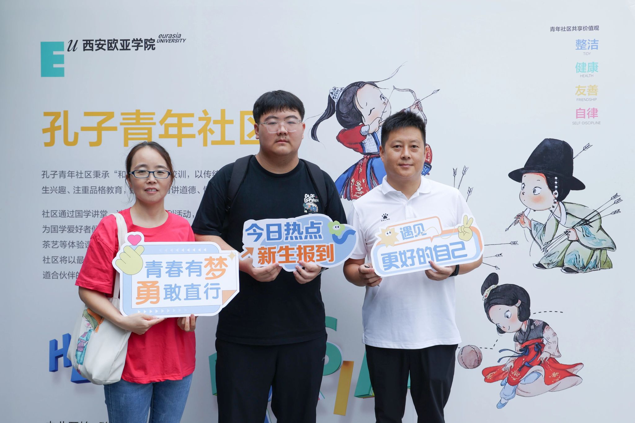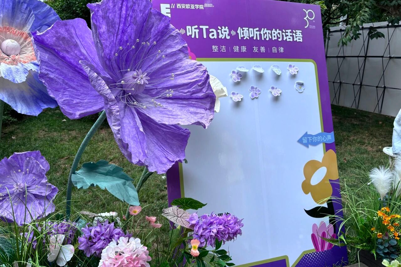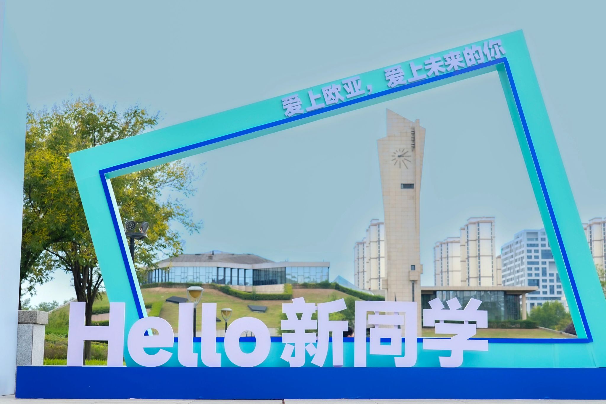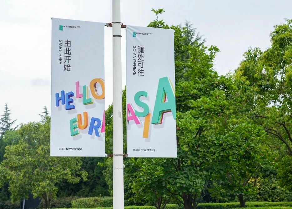 氛围的营造,也藏在细节里。校门口硕大的迎新展板和“Hello 新同学”拍照打卡装置,让人第一眼便感受到节日般的热烈;校园各干道两侧的主题展板与打卡点,记录下欧亚30年的故事与精神,也等待着新同学们留下属于自己的青春印记。