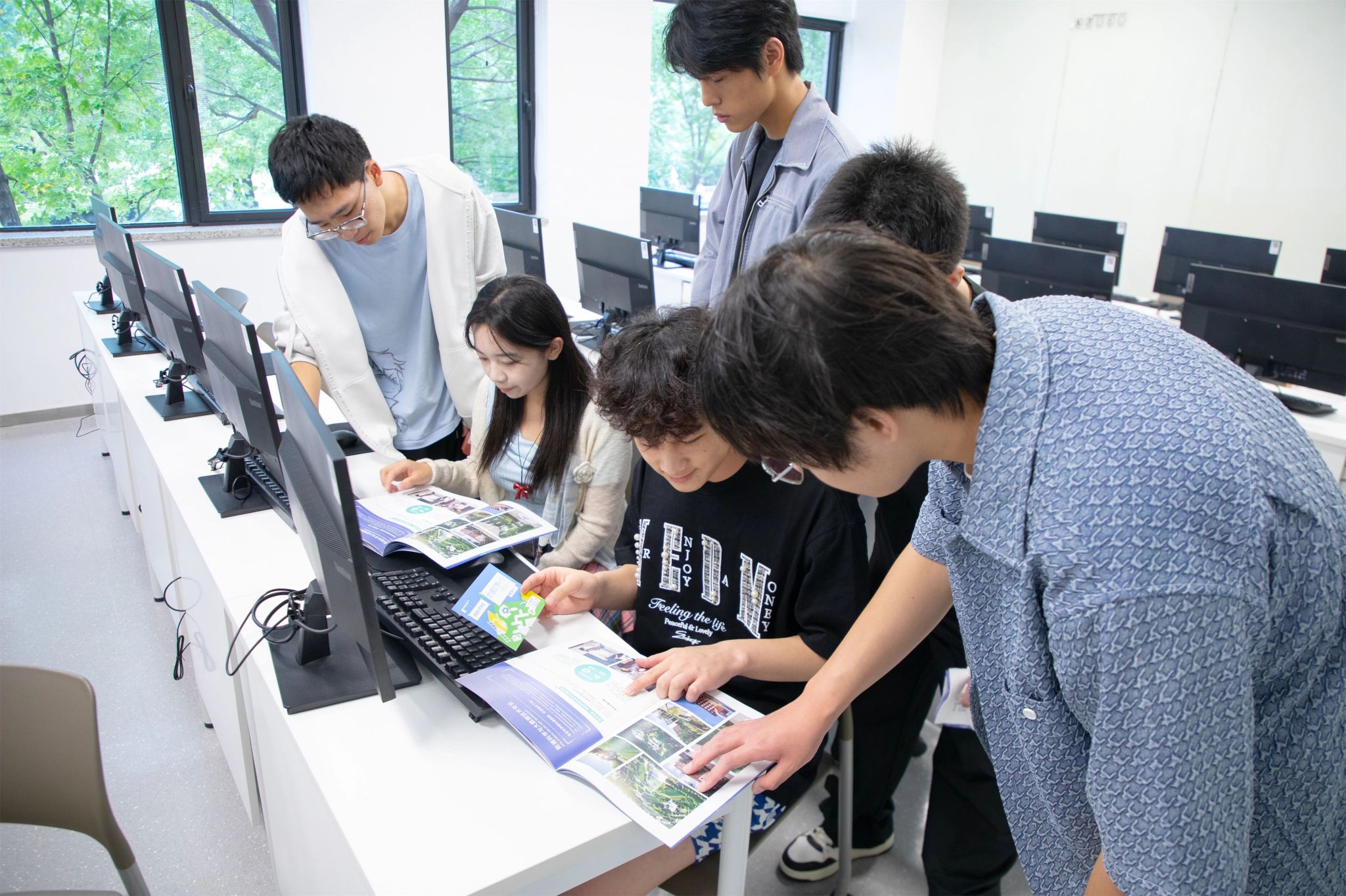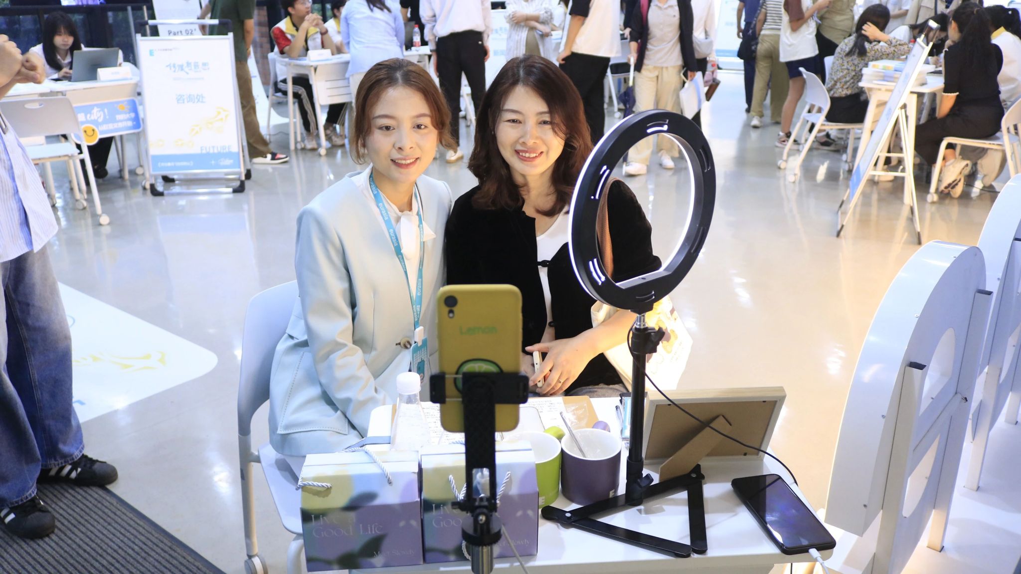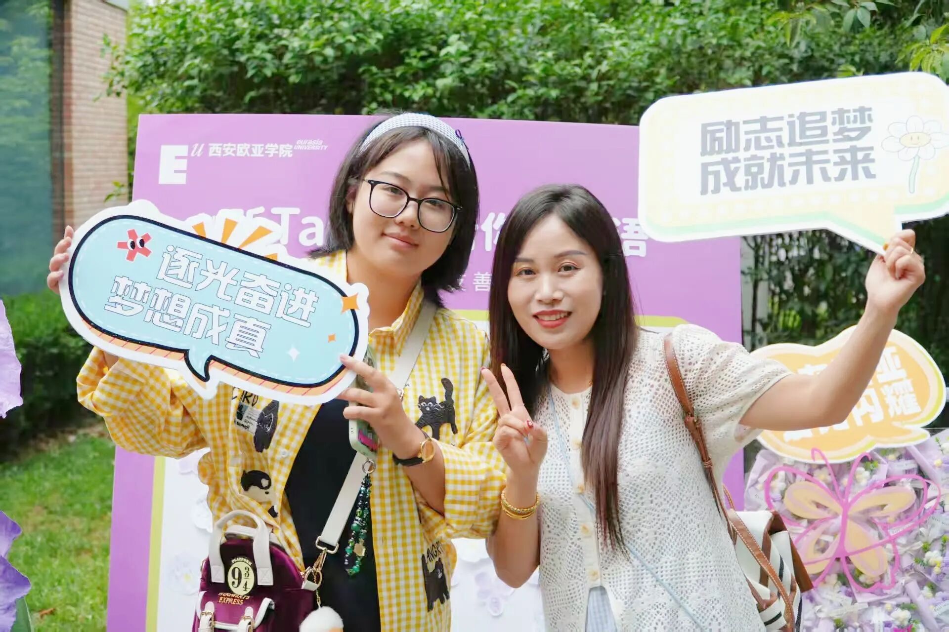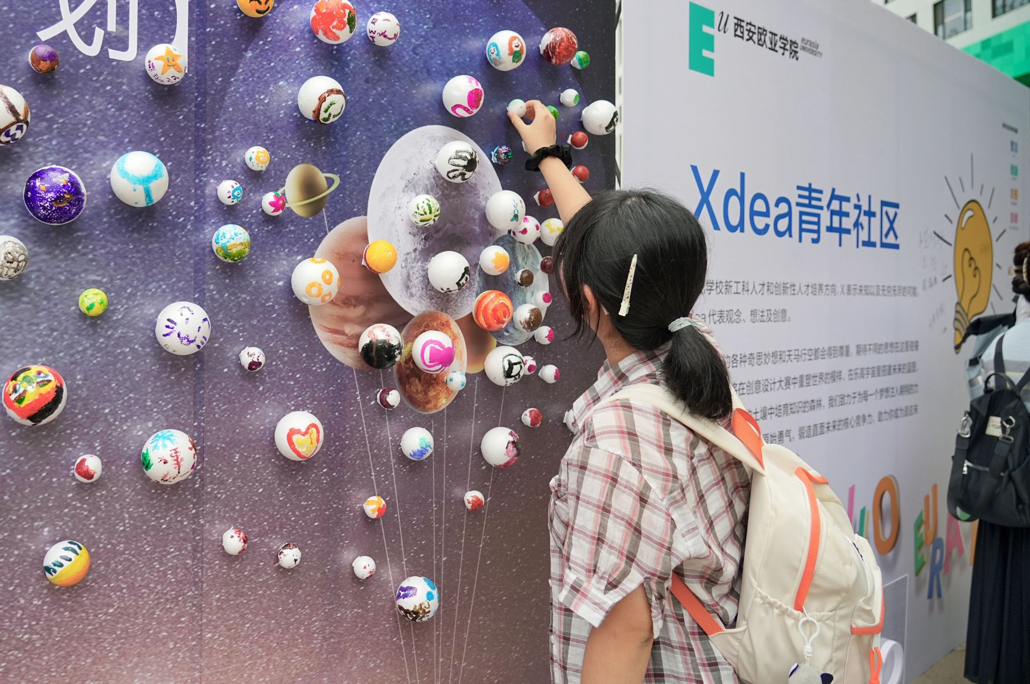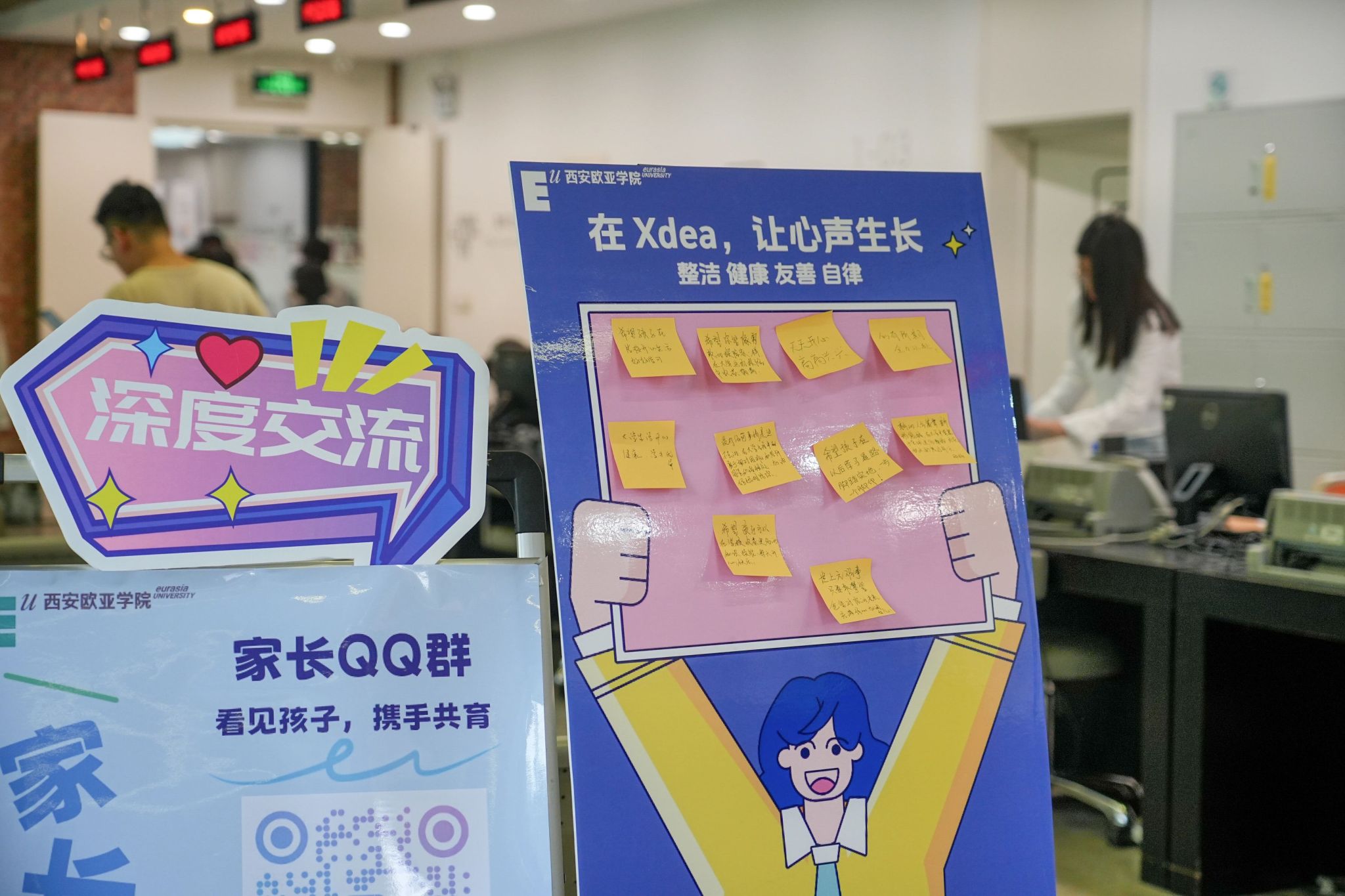 氛围的营造,也藏在细节里。校门口硕大的迎新展板和“Hello 新同学”拍照打卡装置,让人第一眼便感受到节日般的热烈;校园各干道两侧的主题展板与打卡点,记录下欧亚30年的故事与精神,也等待着新同学们留下属于自己的青春印记。