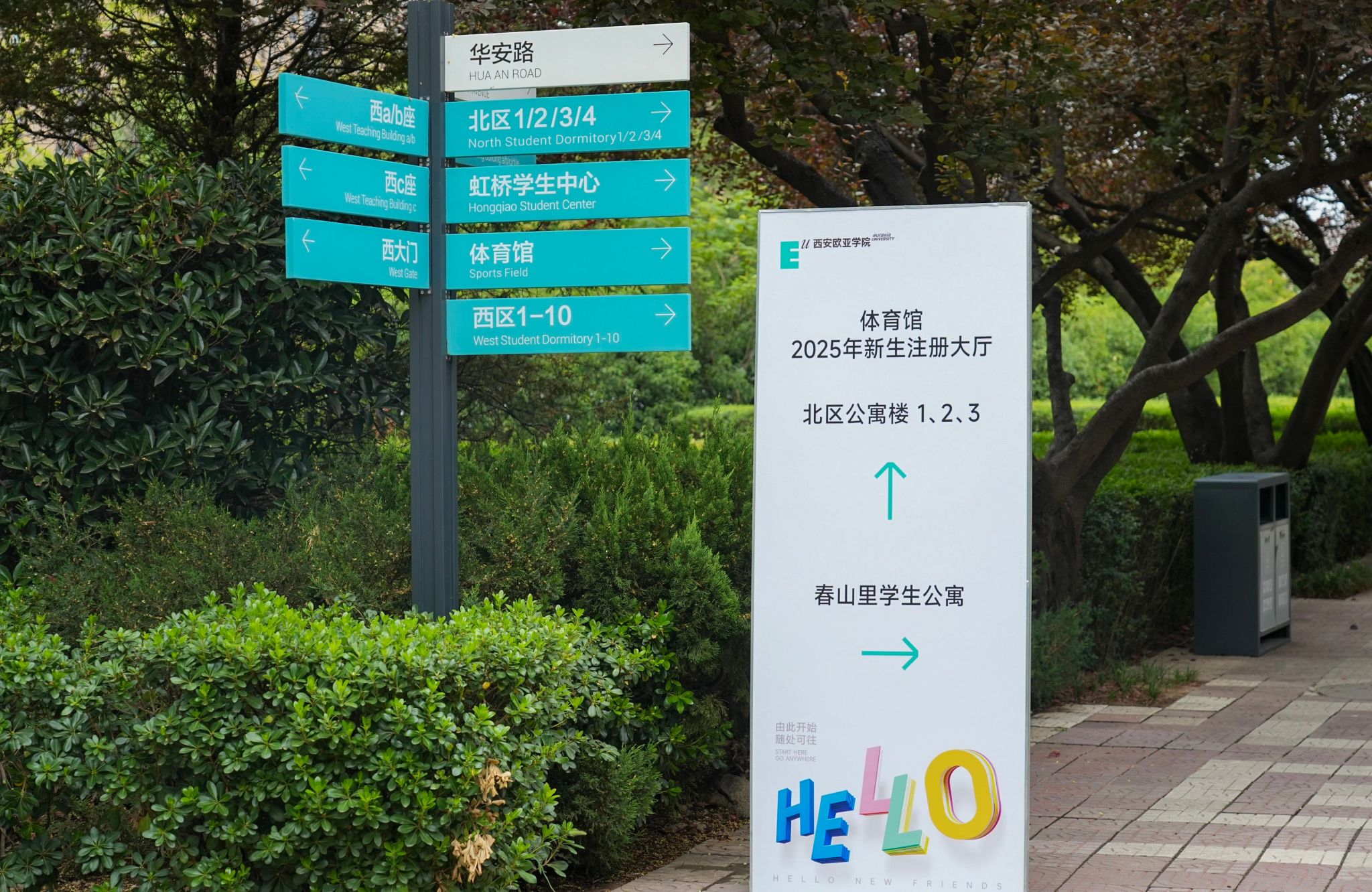 为了让初来乍到的你不再陌生,校园内外设置了清晰的导识系统:从地铁口到校门,从南北区客厅到春山里,再到各分院报到点,随处可见的“欧亚迎新”标识,像一条条明亮的路标,引导新生和家长顺利抵达。