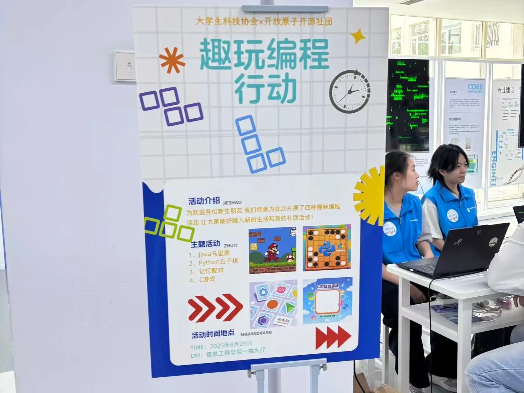 为了让大家更好地融入新的生活与社团活动,学院还特意为新生们设置了四种趣味编程活动:Java马里奥、Python五子棋、记忆配对与C游戏,吸引了众多同学积极加入,现场氛围热烈。