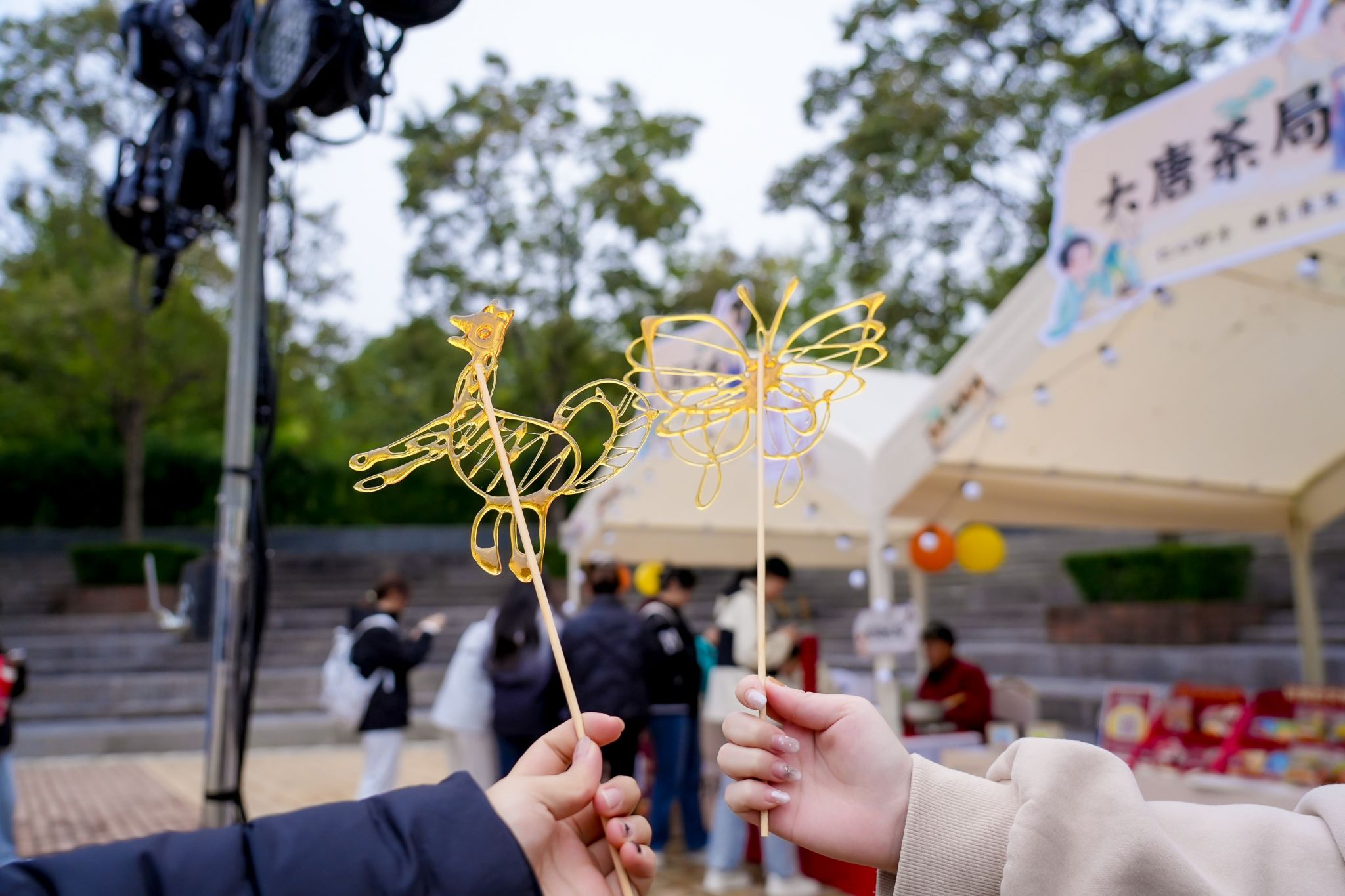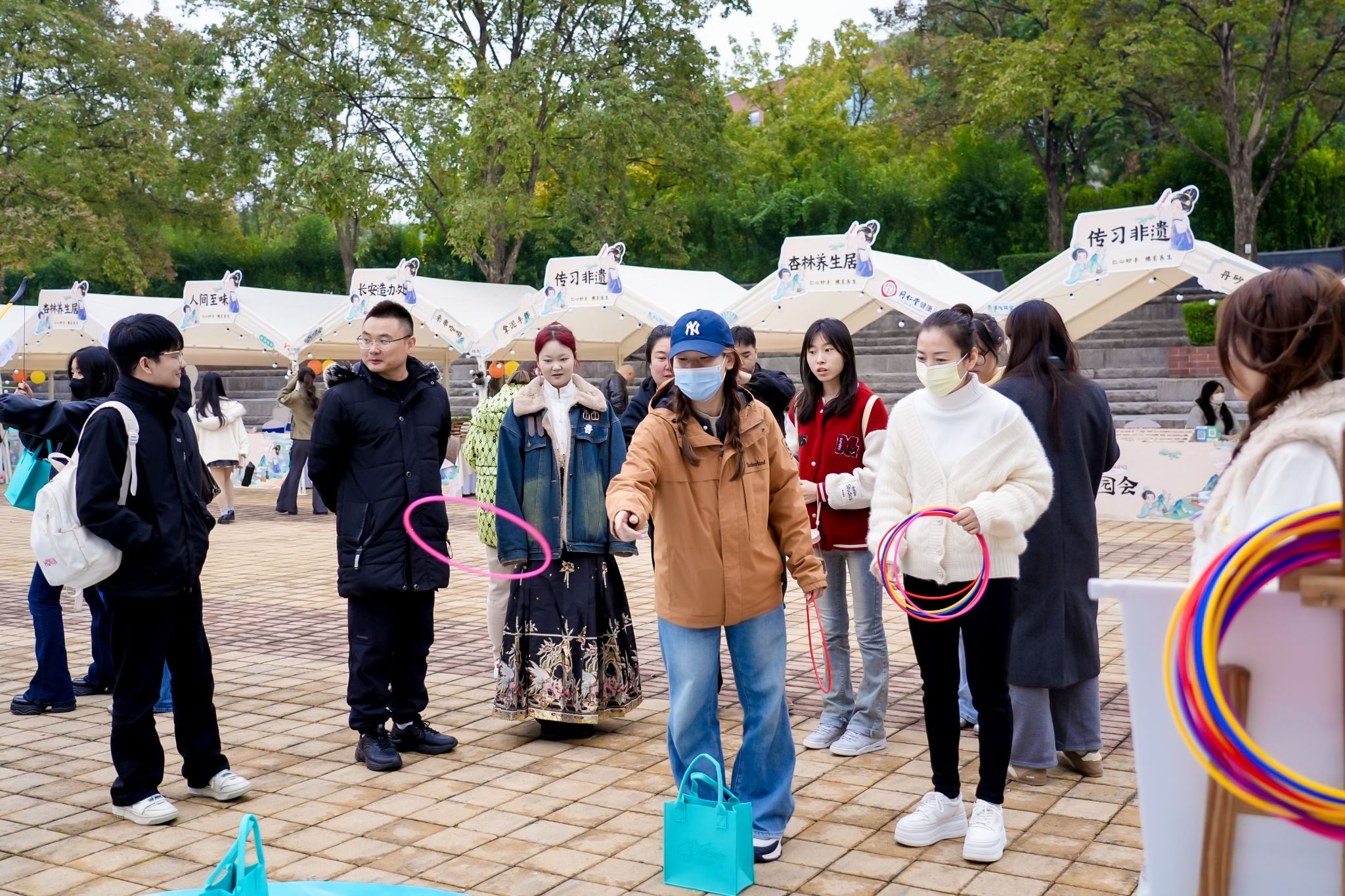 唐风游园会现场同学们体验糖画制作与套圈活动