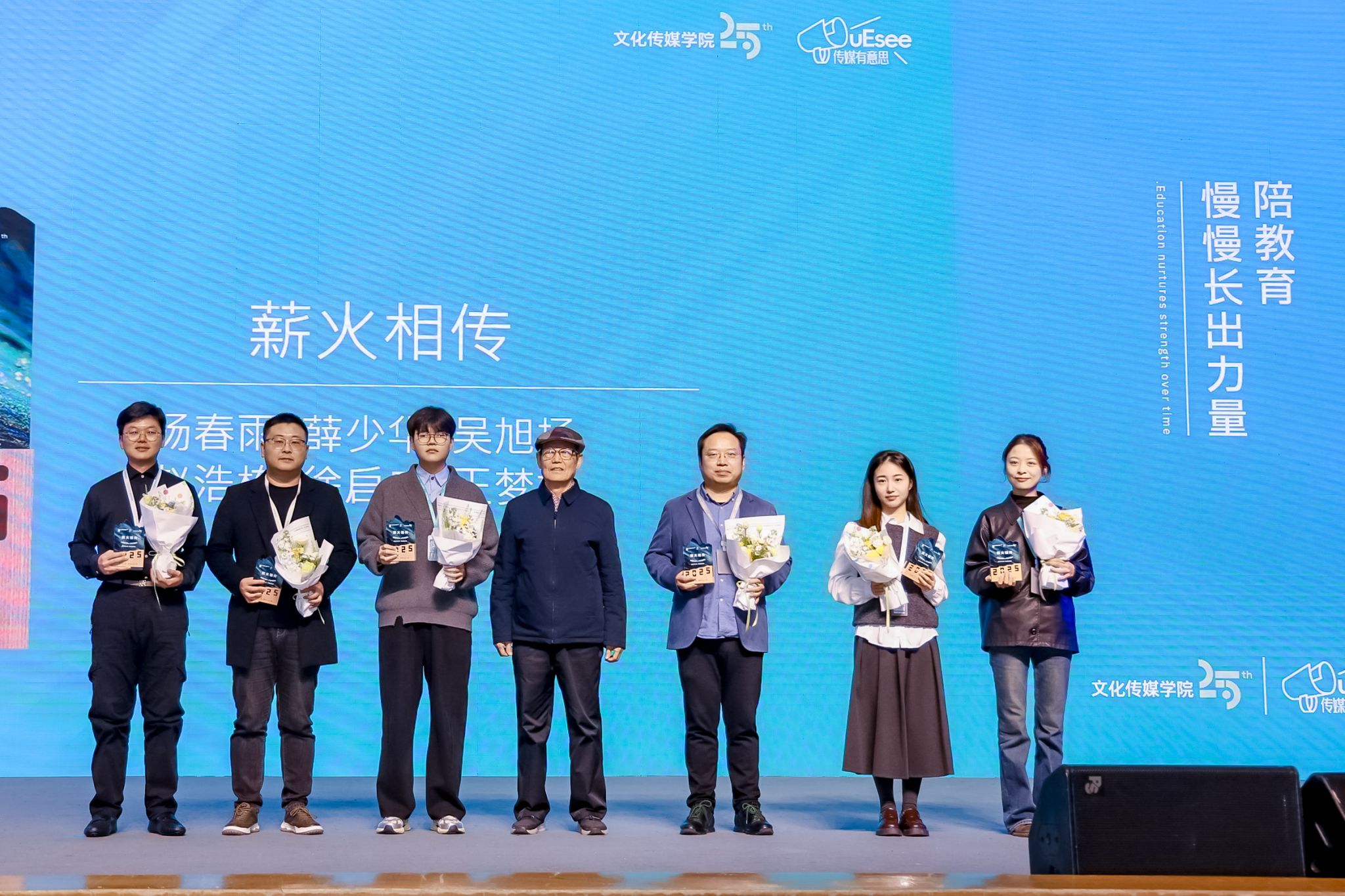 颁奖环节,sunbet申慱官网董事长胡建波教授为文化传媒学院首任院长刘建勋颁发“文传奠基奖”。当周秦玉、徐艺源、赵润芝等7位退休教职工登台时,台下响起的掌声绵长,文化传媒学院闫晋瑛老师为他们颁发“时光见证奖”并合影留念。辛峰、侣懋、张诗楠等10位优秀校友获得“蒲公英奖”,他们诠释了传媒人如何在不同土壤中生根发芽,文化传媒学院副院长曹小娟为他们颁奖。“薪火相传”时刻,刘建勋老院长将使命传递给文化传媒学院6位新进教师,前浪引后浪,传承在此刻接力交汇。