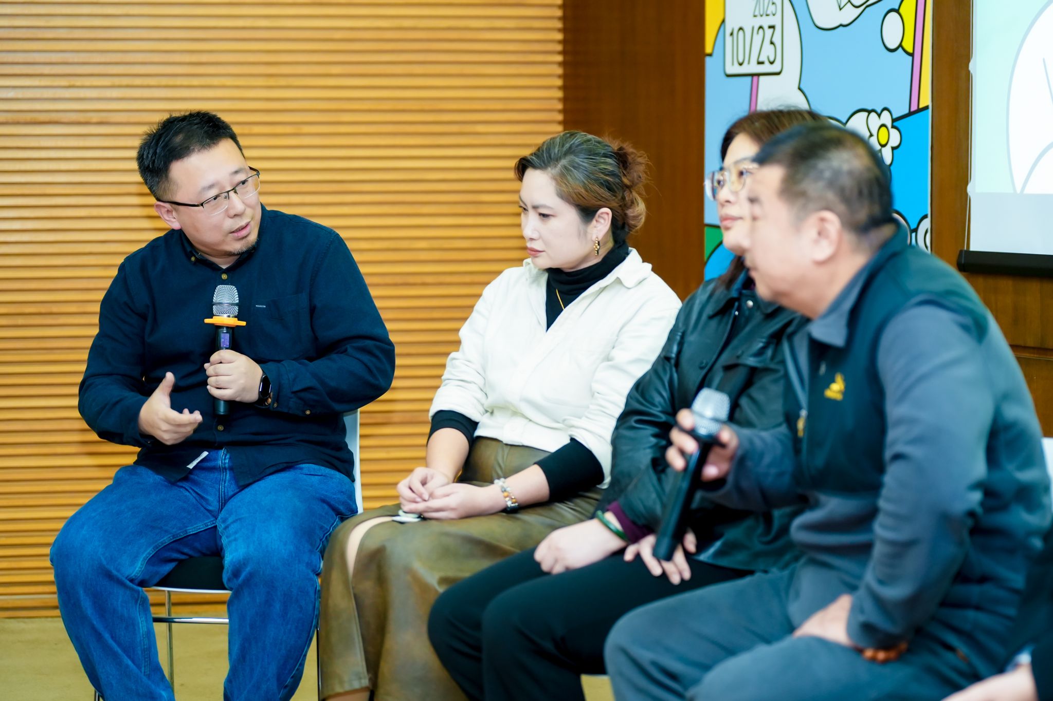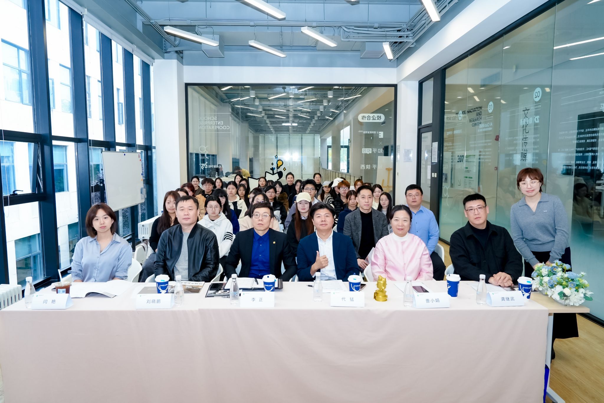 文化传媒学院高昱老师(左一)和三家企业代表对谈