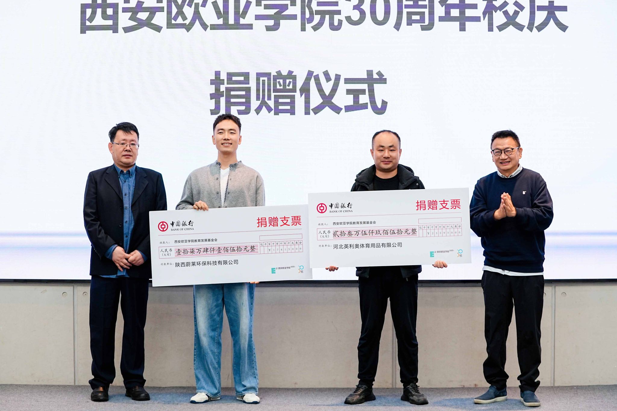河北英利奥体育用品有限公司向学校捐赠23.595万元资金,2014级校友、陕西蔚莱环保科技有限公司总经理刘凯向母校捐赠17.415万元资金