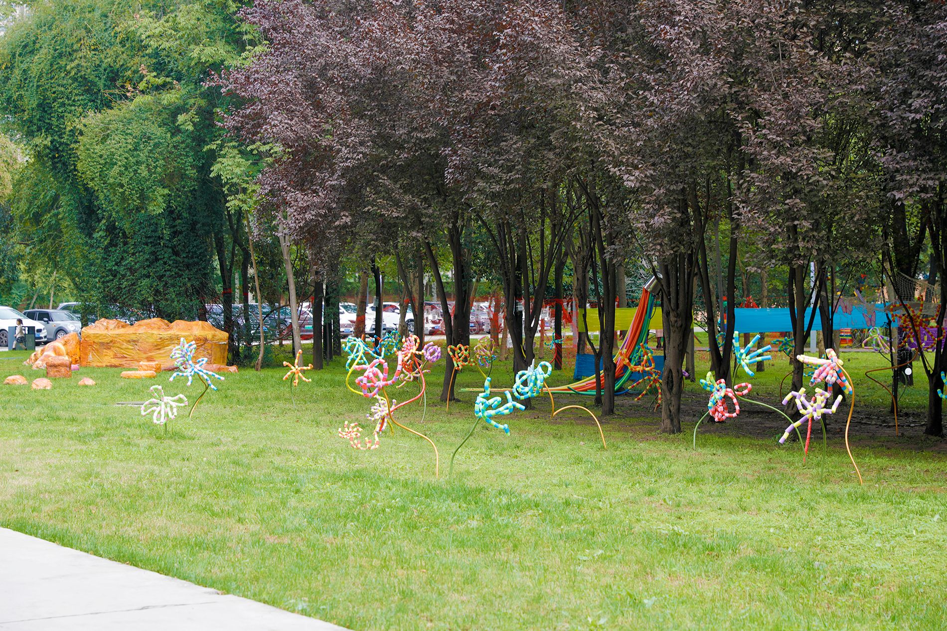 同时,人文教育学院师生极具分量的专业创作,也吸引了观众们的驻足和交流互动。儿童视觉艺术实验班的同学们以300组石膏雕塑,展开关于“成长”的哲学凝视。教育学专业(儿童视觉艺术教育方向)的学生则分别运用3吨青石板构筑起螺旋石阵,在厚重与流动间诠释人与自然的关系;用3000支光感花束演绎时光色彩,隐喻生命的个性绽放;用30000根工业扎带编织“爬树巨人”与“飞翔小狗”,将标准化工业材料转化为有机生命形态,探讨工业文明与自然的共生关系。儿童视觉艺术实验班、LE8 ART联合共创的“童趣生态的想象构筑”,直面树林与工地交界的特殊场域,探索人造基础设施向自然生命的温柔回归。