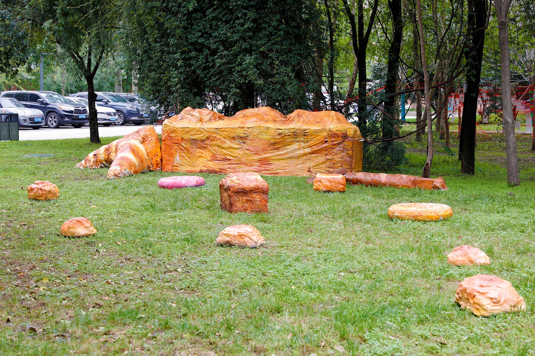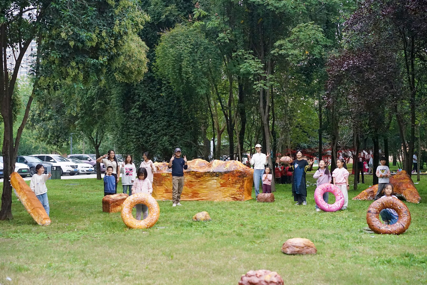 作品以面包为创作主题,通过木条构架与宣纸肌理,建构出质朴的载体,孩子们亲手绘制的金黄面包错落点缀于草坪,创造出独特的通感体验。
