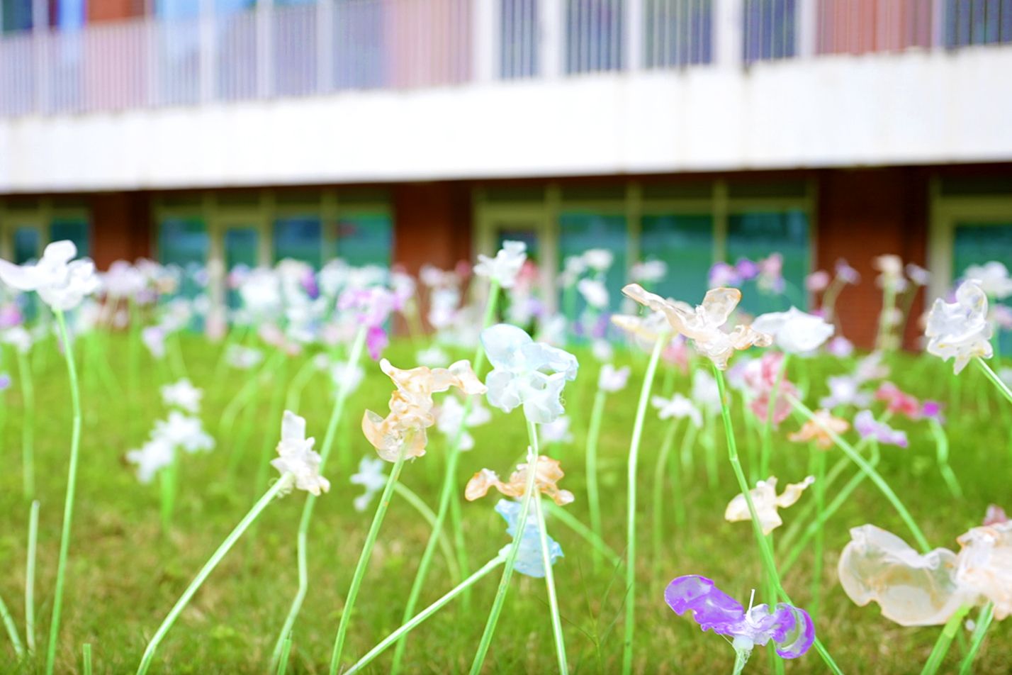 3000支感光热缩片花朵随紫外线照射变色,从透明至炫彩,隐喻生命在时光中的个性绽放,体现“因材施教”的理念实践。