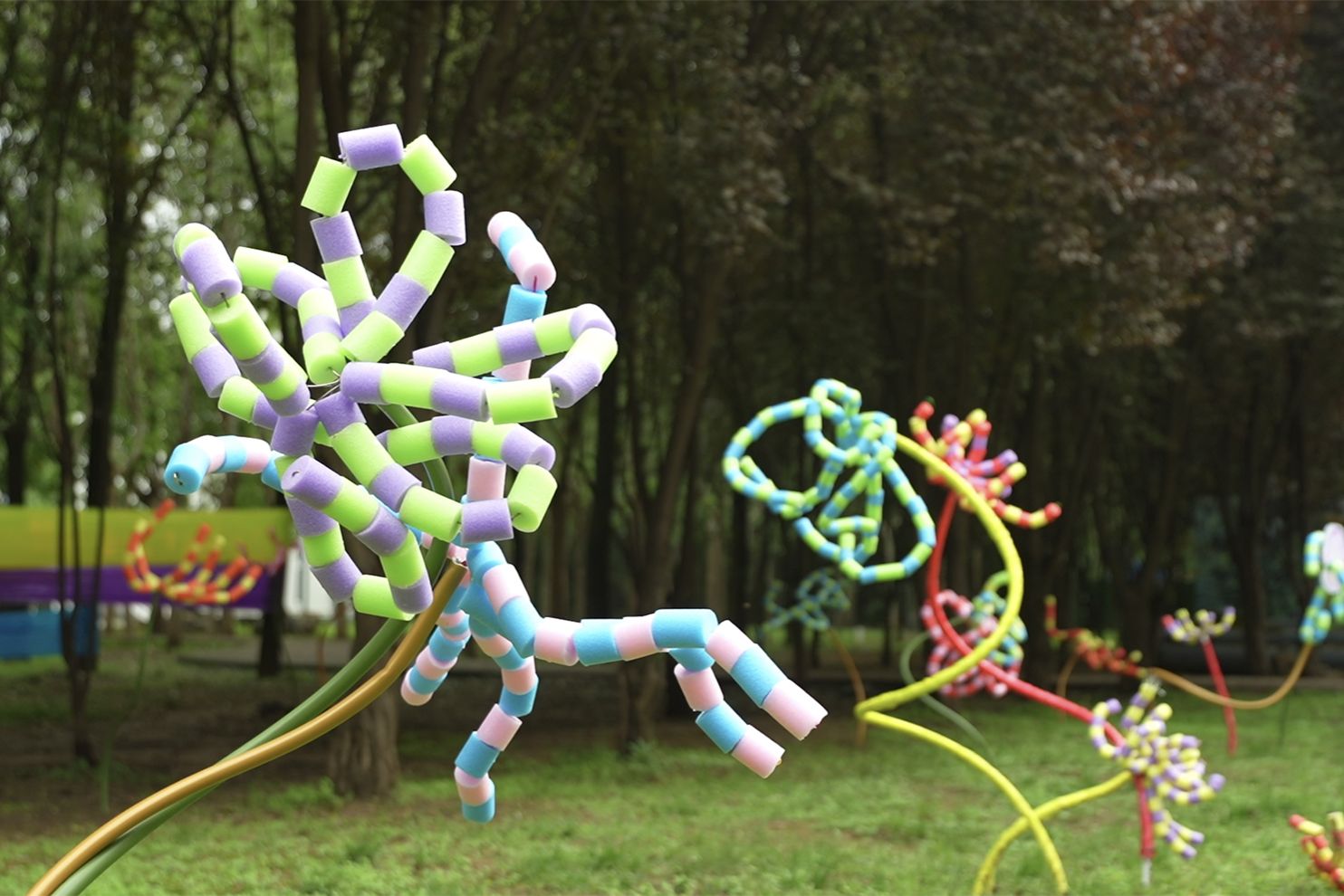作品打造了一个60平方米的沉浸式空间,运用彩色珍珠棉棒、金属线等多元材料,构建出一座充满童真想象的蜕变之所,通过多感官设计,让观众体验生命蜕变的完整历程。