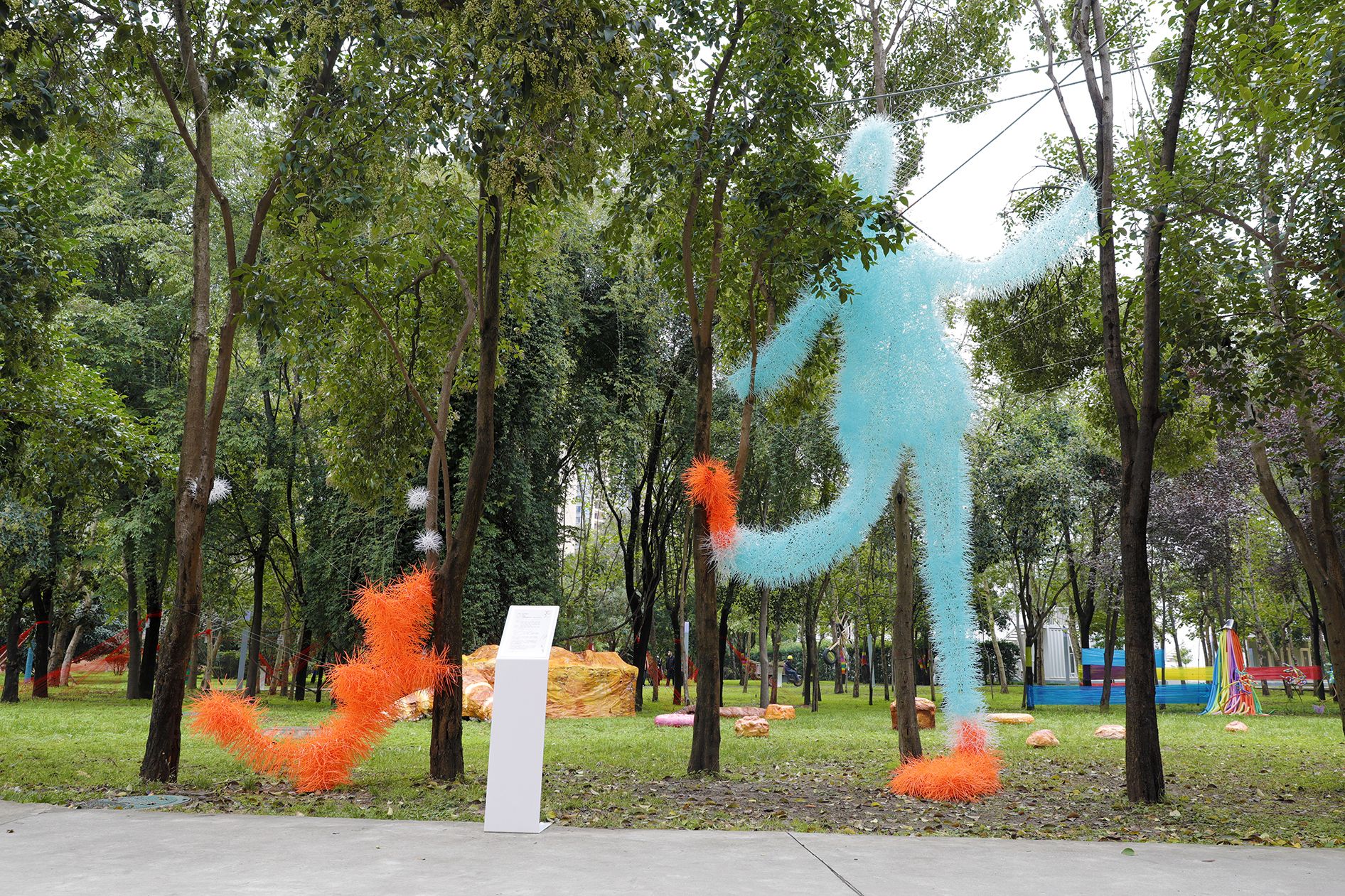 用30000根工业扎带编织“爬树巨人”与“飞翔小狗”,将标准化工业材料转化为有机生命形态,探讨工业文明与自然的共生关系。
