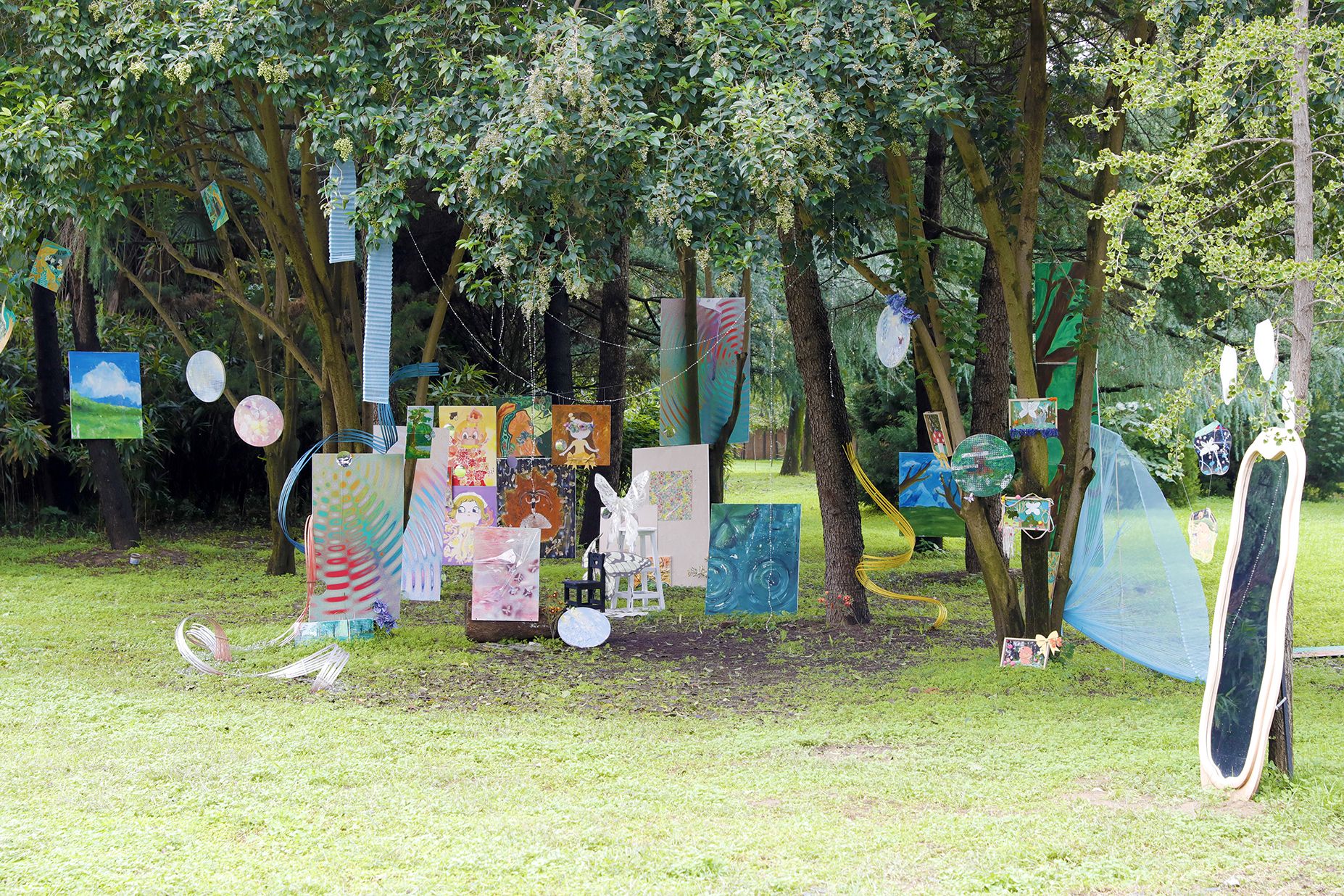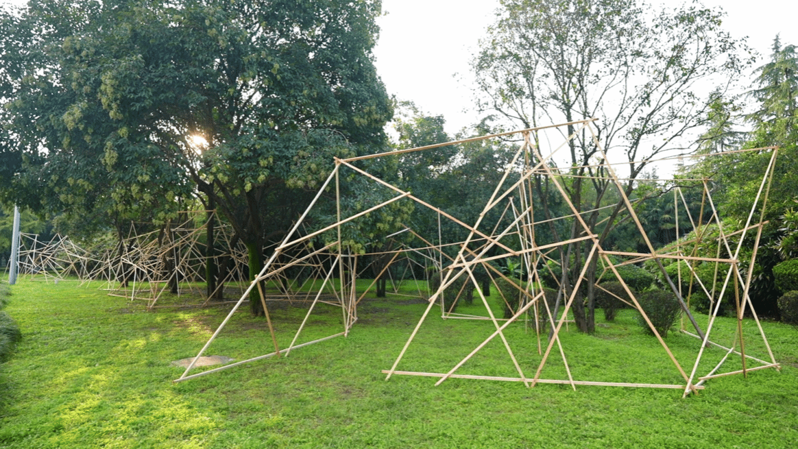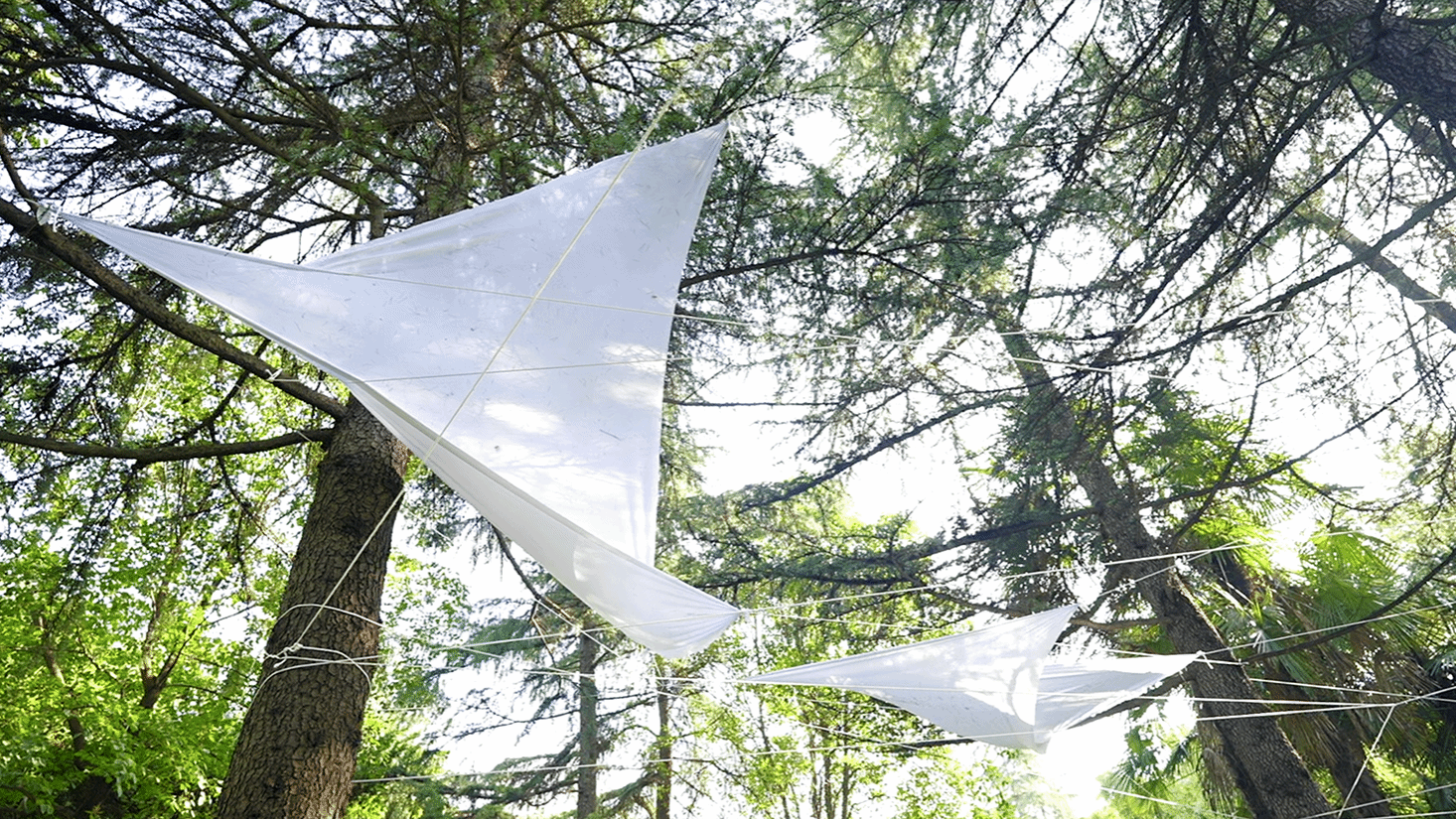 以白布与尼龙绳在林木间构筑出一座漂浮的半透明穹顶,通过材质的轻盈特性与自然元素形成深度对话,创造出可供冥想、舞动的开放场域。