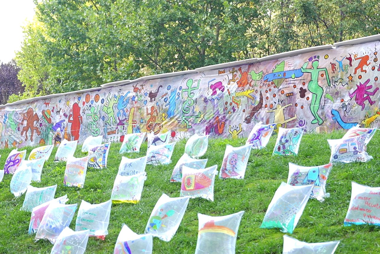 其中,校外参展单位的作品呈现了对儿童艺术教育的深刻理解和多元探索。大家集体共创的涂鸦长廊,以自由挥洒的集体创作,开启了一场关于色彩与想象的狂欢。不知艺术学院带来的“光之穹顶”“Hi”“穿林之所”3件作品,分别以轻盈材质构筑冥想空间,以生动手势连接人与自然,以廊道引导沉浸体验,启发观者多维度探索艺术与场域的关系。唐门艺术12名孩子创作的“破茧之屋”作品,在草坪上搭建起一座60多平米的兼具美感与温度的“破茧蜕变之所”,让孩童对自然的奇思妙想有了具象载体。LE8 ART和斑斓绘本美术共同呈现的“甜蜜的草坪”作品充分激发味蕾,孩子们亲手绘制的“金黄面包”错落点缀于草坪,创造出独特的通感体验。彩色树儿童美育工作室创作的“呼吸 水源 循环”作品,让孩子们能够更加直观地理解生态循环的奥秘。