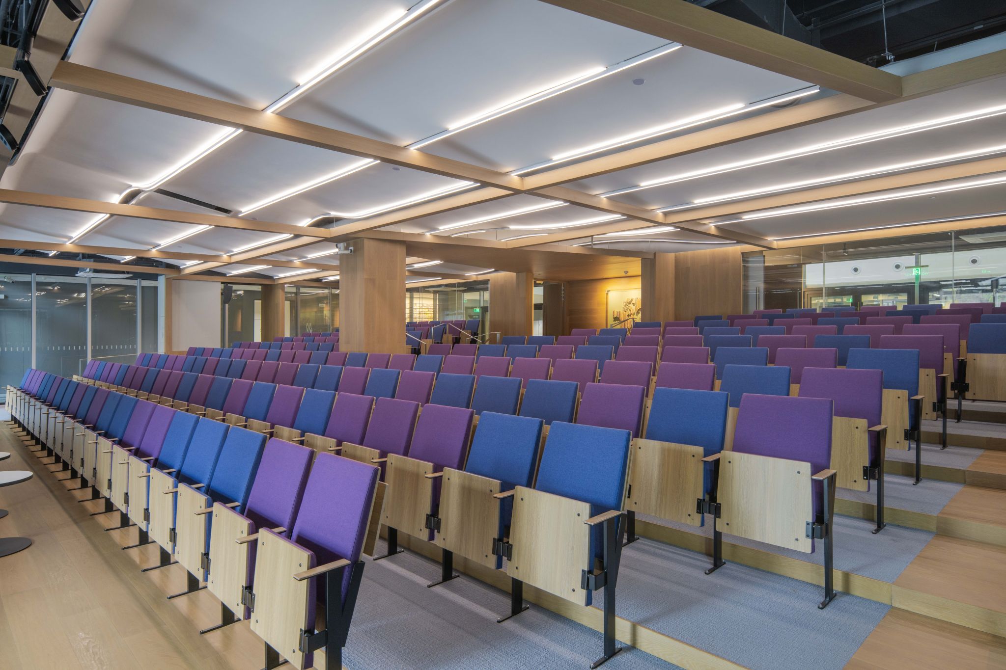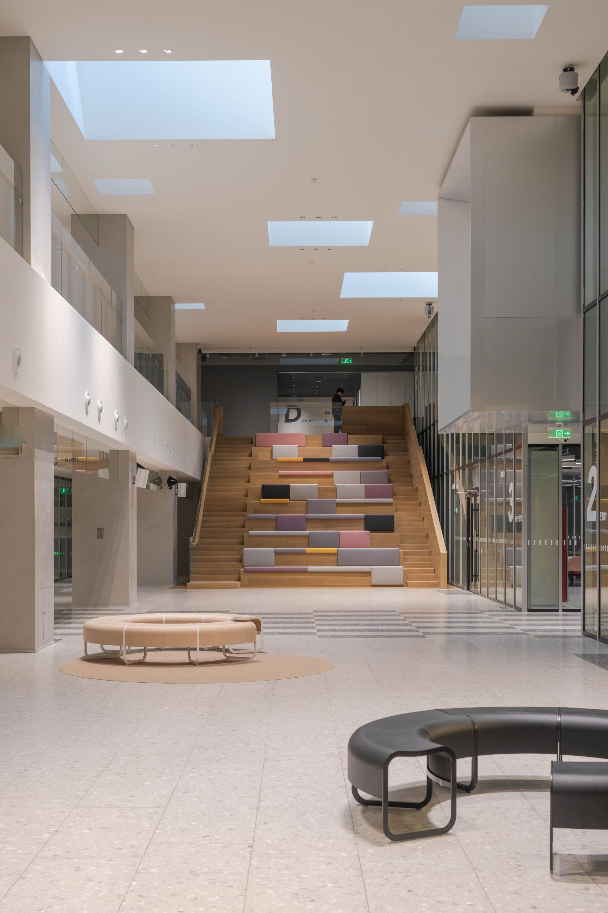 裙楼内部设有泡泡空间(圆形教室)、鼓励自由交流的非正式学习区、公共讨论区、校企合作会议室、兼具休闲与展览功能的复合空间、以及充满社交氛围的咖啡厅等,讲座、展览、艺术品展陈等活动也将在这里发生,激发即兴的交流与碰撞。