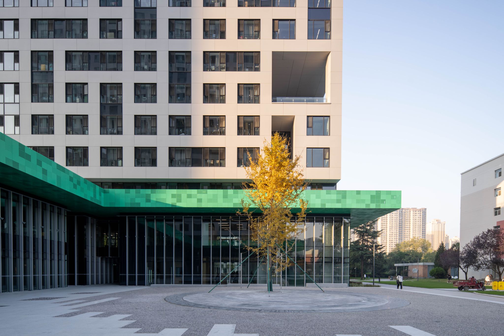 因此,团队确立了高层集约型的设计方向,从根本上避免土地资源的浪费。方案最终确定为两栋公寓楼及两层裙房。建筑高度达72米,地上20层,地下2层,集中提供888套学生公寓,可容纳3000余名学生。这一高度集约化的布局,将学生的“衣食住行”高效整合于有限的土地之上,同时也使其成为校园西区的显著地标,与东区建筑群形成视觉呼应,重塑了校园的空间结构。