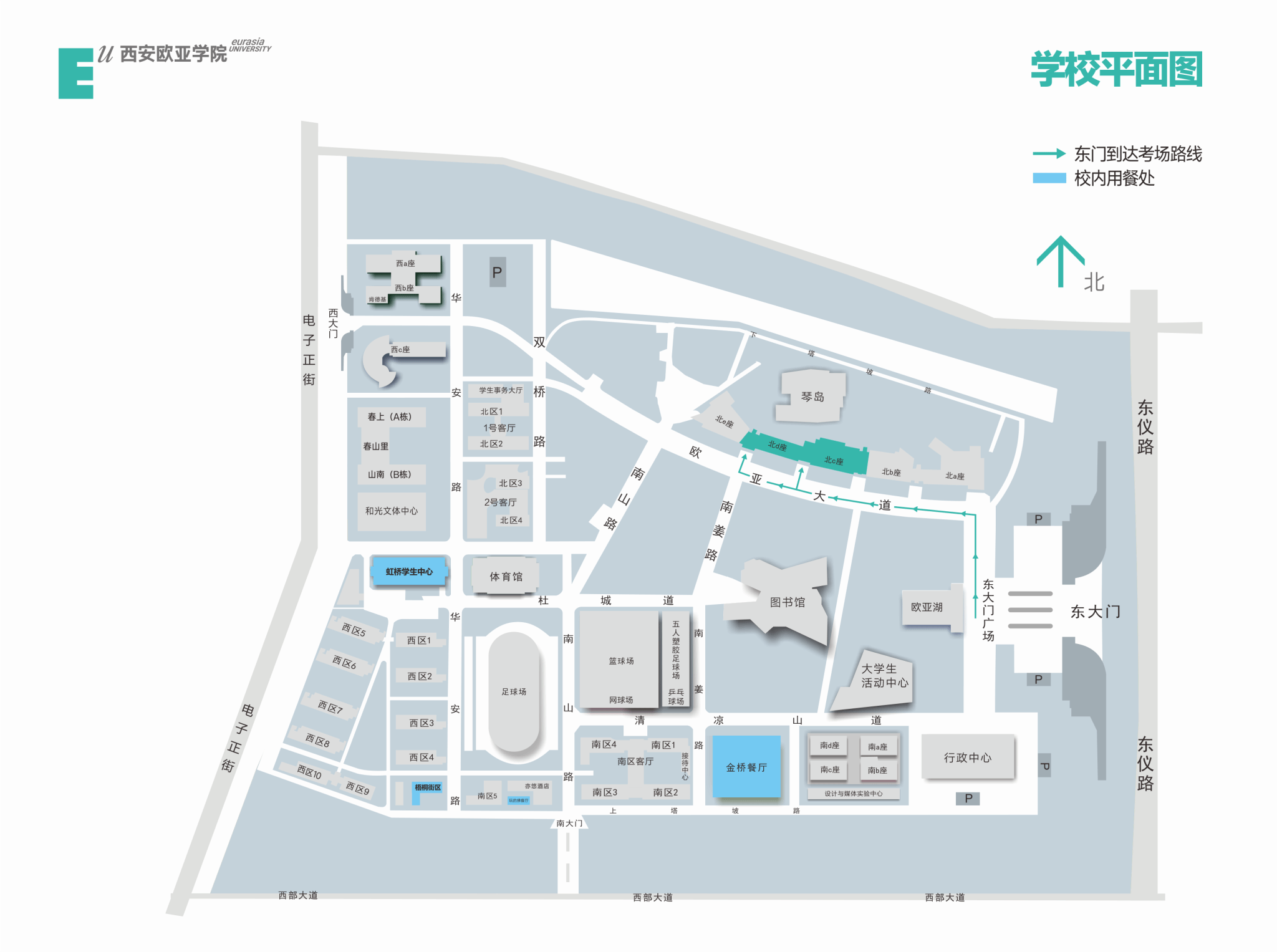 sunbet申慱官网考点位于陕西省西安市雁塔区东仪路8号,请各位考生从申慱官网东门进入,考场位于教学北区C、D座教学楼。因进入考试封闭区和考场时需要接受智能安检、存放物品以及身份验证,请考生至少提前1小时到达考点,留足入场检查时间,以免影响考试。考试楼宇位置及进校路线见下图