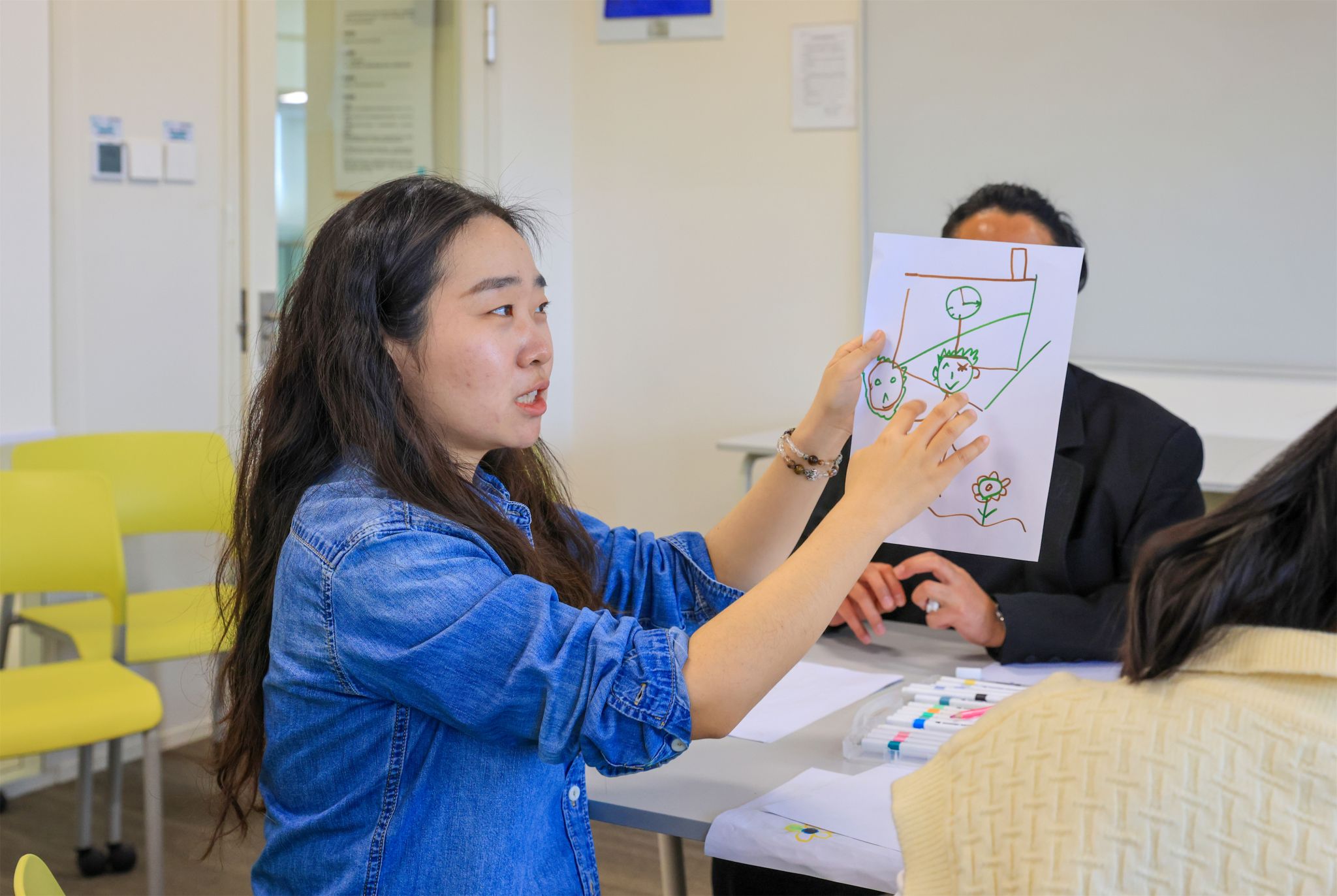 近年来,人文教育学院不断改革课程体系,致力于促进中国儿童教育行业理念与教育教学技术的创新与变革。当天下午,学院特别为新东方参访团队准备了“欧亚课程体验卡”,邀请大家亲身参与以音乐、绘画和舞蹈为主题的疗愈工作坊,在身体力行的肢体与行为表演中,觉察生命本真和人文教育的实践价值。