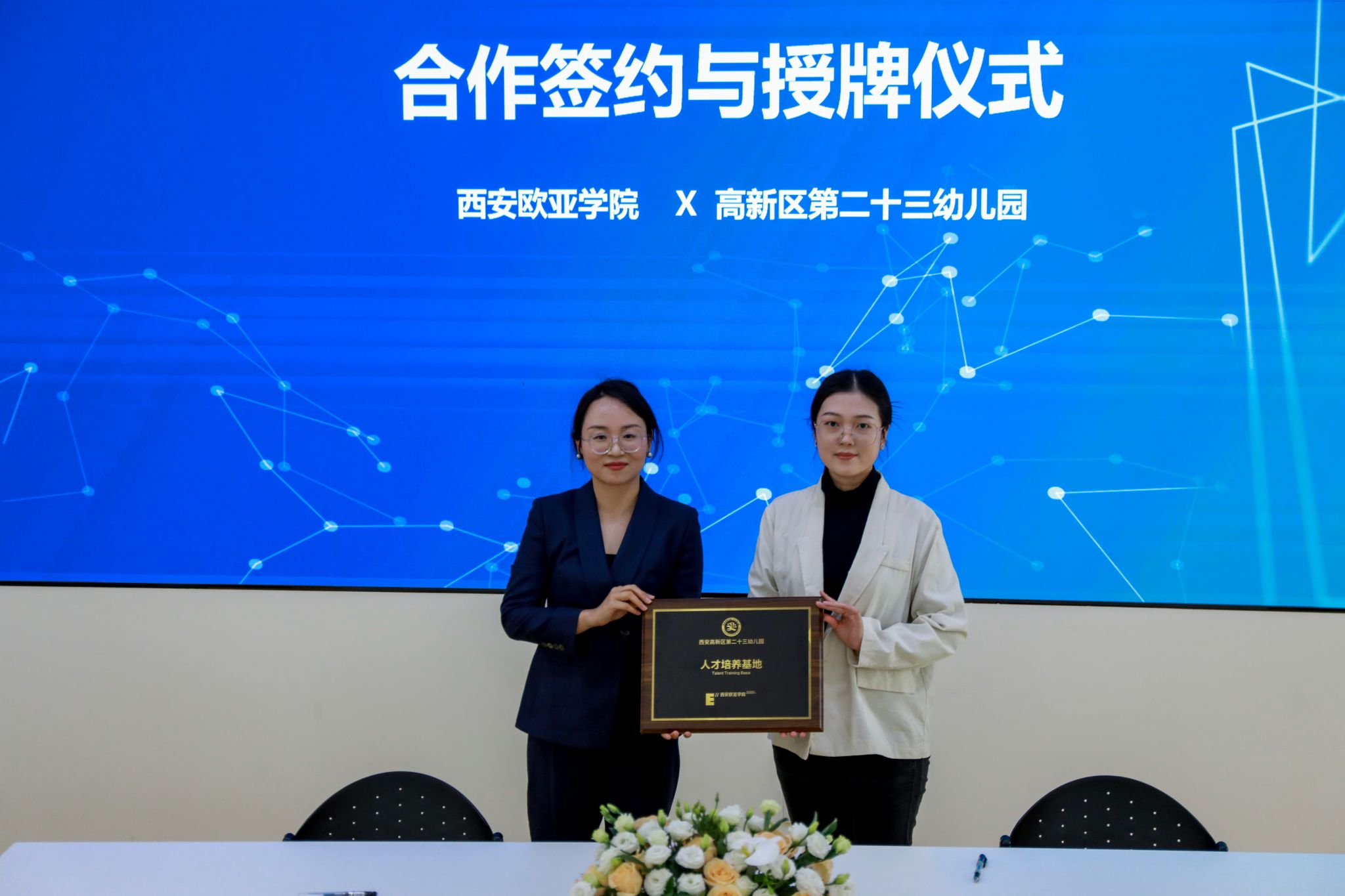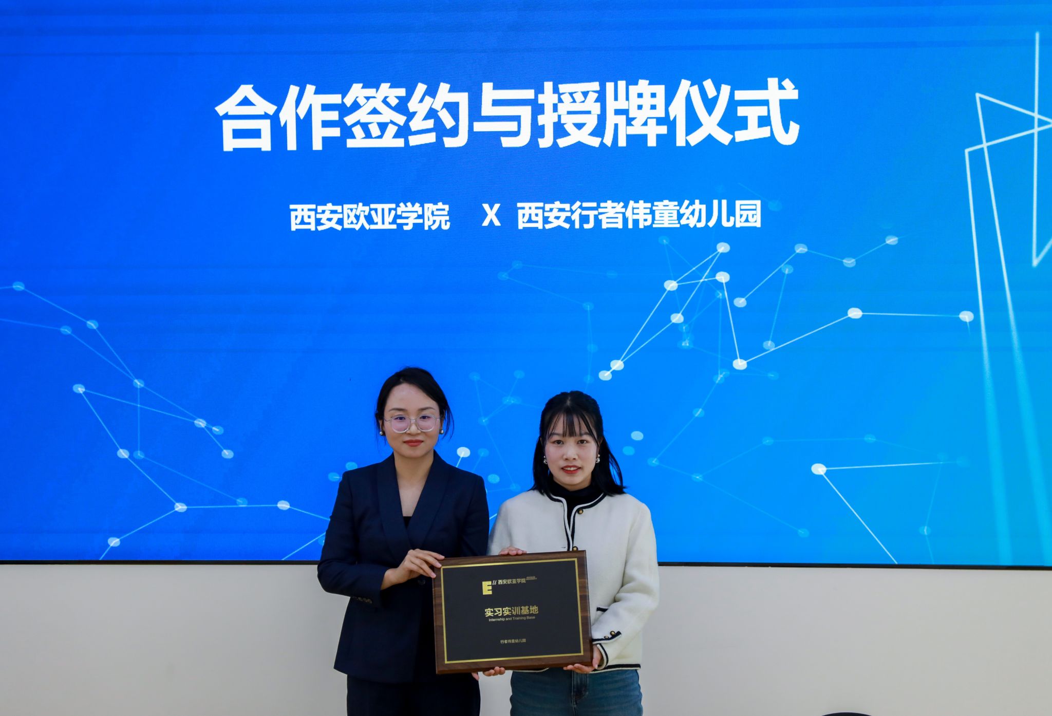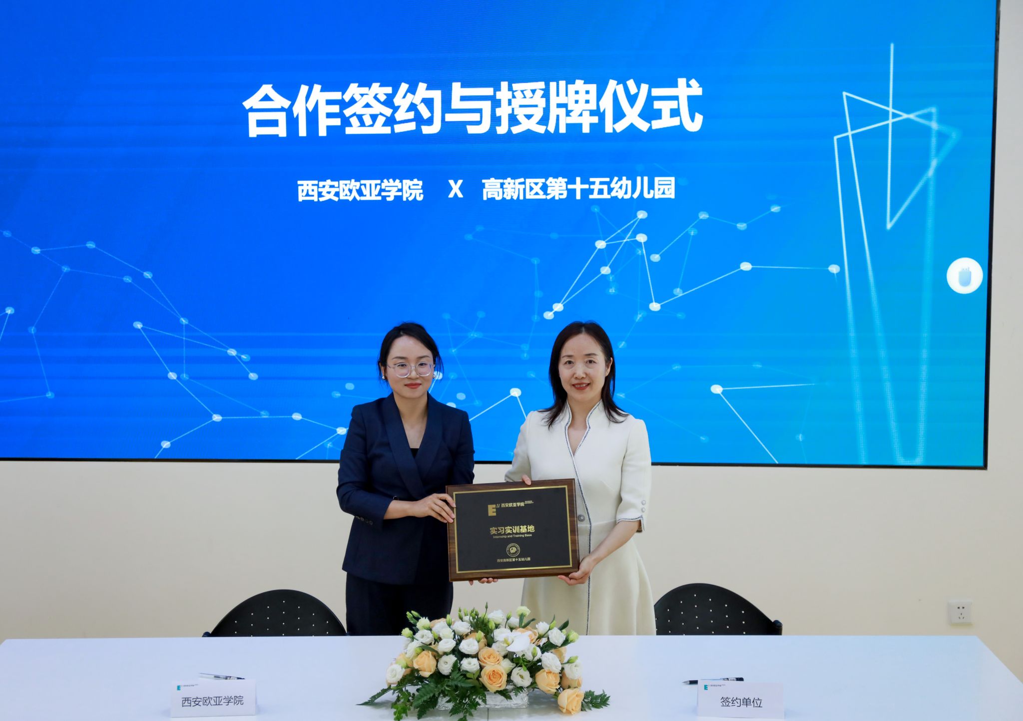 签约仪式上,欧亚学院职业教育学院小学教育、学前教育专业的优秀实习生分享了实习过程中的深刻体会。小学教育专业2301班的王晨怡,有幸在西安高新区第十八小学实习,在教学与班级管理上均颇有心得,如创设情境教学、建立个性化档案等,收获 “教学相长” 的体悟。学前教育专业2306班常译元在西安市高新区第二十三幼儿园实习时,在老师悉心指导下,其重新构建教学认知,以游戏和观察为指引,助力幼儿表达与成长 。