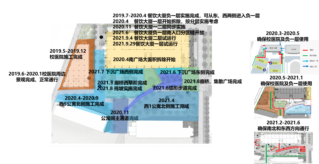 “一切为了学生”。于是室外景观分区域改造,室内空间先改负一层,再改一、二层的模式,开启了三年建设之路。结合体育场临时用餐点的设置,使得西区学生的就餐、生活问题正常开展。